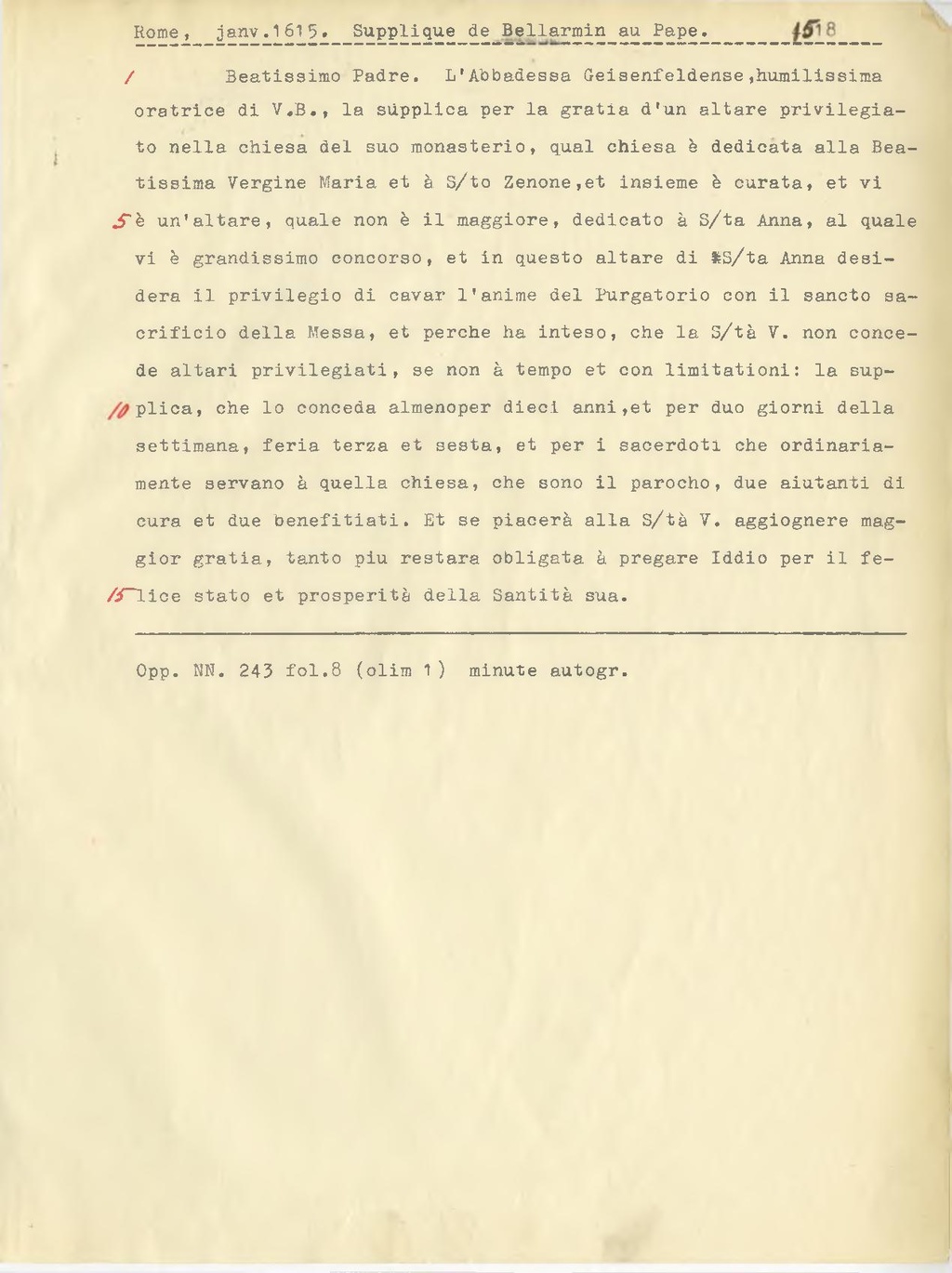 Beatissimo Padre. L'Abbadessa Geisenfeldense[1], humilissima oratrice di V.B., la supplica per la gratia d'un altare privilegiato nella chiesa del suo monasterio, qual chiesa è dedicata alla Beatissima Vergine Maria et a S.to Zenone, et insieme è curata, et vi è un'altare, quale non è il maggiore, dedicato a S.ta Anna, al quale vi è grandissimo concorso, et in questo altare di S.ta Anna desidera il privilegio di cavar l'anime del Purgatorio con il sancto sacrificio della Messa, et perché ha inteso, che la S.tà V. non concede altari privilegiati, se non à tempo et con limitationi[2]; la supplica, che lo conceda almeno per dieci anni, et per duo giorni della settimana, feria terza e sesta, et per i sacerdoti che ordinariamente servano à quella chiesa, che sono il parocho, due aiutanti di cura et due benefitiati. Et se piacerà alla S.tà V. aggiognere maggior gratia, tanto più restare obligata a pregare Iddio per il felice stato et prosperità della Santità sua.