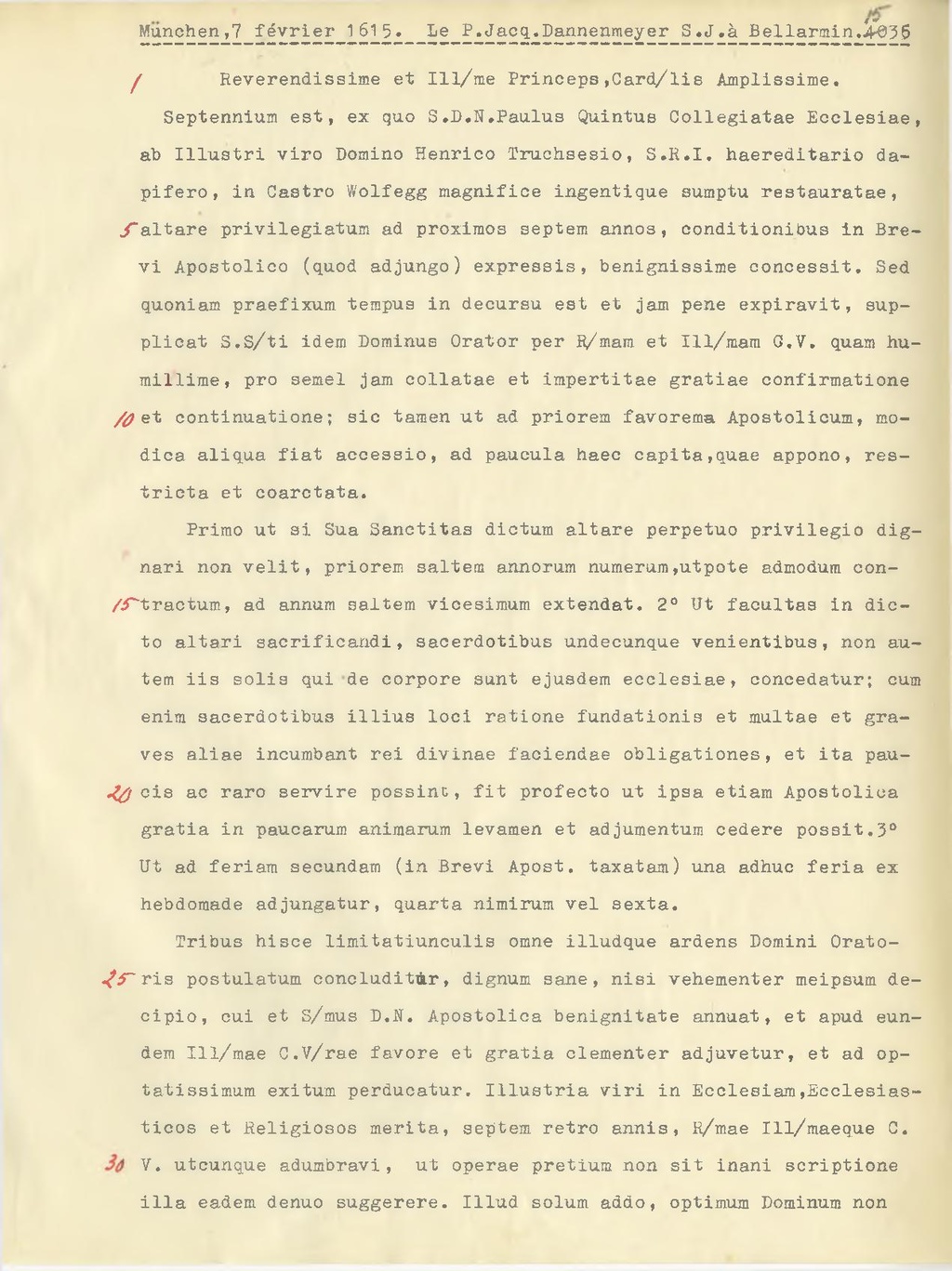 Reverendissime et Ill.me Princeps, Card.lis Amplissime. Septennium est, ex quo S.D.N. Paulus Quintus Collegiatae Ecclesiae, ab Illustri viro Domino Henrico Truchsesio, S.R.I. haereditario dapifero, in Castro Wolfegg magnifica ingentique sumptu restauratae, altare privilegiatum ad proximos septem annos, conditionibus in Brevi Apostolico (quod adjungo) expressis, benignissime concessit. Sed quondam praefixum tempus in decursu est et jam pene expiravit, sup plicai S. S.ti idem Dominus Orator per E.mam et Ill.mam O.V. quam humillime, pro semel jam collatae et impertitae gratiae confirmatione et continuatione; sic tamen ut ad priorem favorema Apostolicum, mo dica aliqua fiat accessio, ad paucula haec capita,quae appone, restricta et coarctata.
