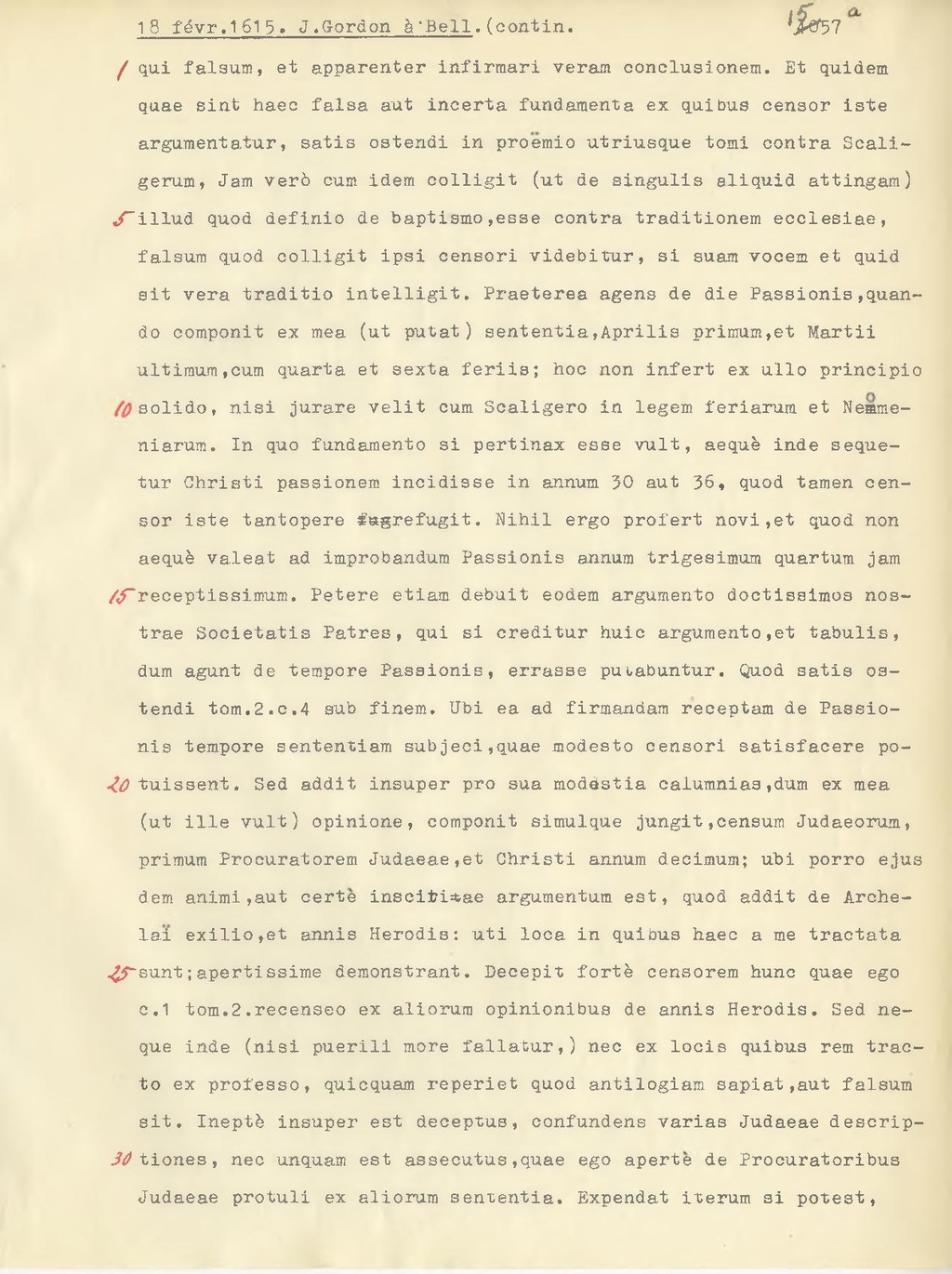 falsum, et apparenter infirmari veram conclusionem. Et quidem quae sint haec falsa aut incerta fundamenta ex quibus censor iste argumentatur, satis estendi in proemio utriusque tomi centra Scaligerum, Jam verò cum idem colligit (ut de singulis aliquid attingam) illud quod definio de baptismo, esse contra traditionem ecclesiae, falsum quod colligit ipsi censori videbitur, si suam vocem et quid sit vera traditio intelligit. Praeterea agens de die Passionis, quando componit ex mea (ut putat) sententia, Aprilis primum, et Martii ultimum, cum quarta et sexta feriis; hoc non infert ex ullo principio solido, nisi jurare velit cum Scaligero in legem feriarum et Nemmeniarum. In quo fondamento si pertinax esse vult, aequi inde sequetur Christi passionem incidisse in annum 30 aut 36, quod tamen censor iste tantopere refugit. Nihil ergo profert novi, et quod non aequi valeat ad improbandum Passionis annum trigesimum quartum jam receptissimum. Patere etiam debuit eodem argumento doctissimos nostrae Societatis Patres, qui si creditur huic argumento, et tabulis, dum agunt de tempore Passionis, errasse putabuntur. Quod satis ostendi tom.2. c.4 sub finem. Ubi ea ad firmandam receptam de Passionis tempore sententiam subjeci, quae modesto censori satisfacere potuissent. Sed addit insuper pro sua modestia calumnias, dum ex mea(ut ille vult) opinione, componit simulque jungit, censum Judaeorum, primum Frocuratorem Judaeae, et Christi annum decimum; ubi porro ejus dem animi, aut certe inscitiae argumentum est, quod addit de Archelai exilio, et annis Herodis: uti loca in quibus haec a me tractata sunt; apertissime demonstrant. Decepit fortè censorem hunc quae ego c.l tom.2. recenseo ex aliorum opinionibus de annis Herodis. Sed neque inde (nisi puerili more fallatur,) nec ex locis quibus rem tracto ex professo, quicquam reperiet quod antilogiam sapiat, aut falsum sit. Ineptè insuper est deceptus, confundens varias Judaeae descriptiones, nec unquam est assecutus, quae ego aperte de Procuratoribus Judaeae protuli ex aliorum senmentia. Expendat iterum si potest,