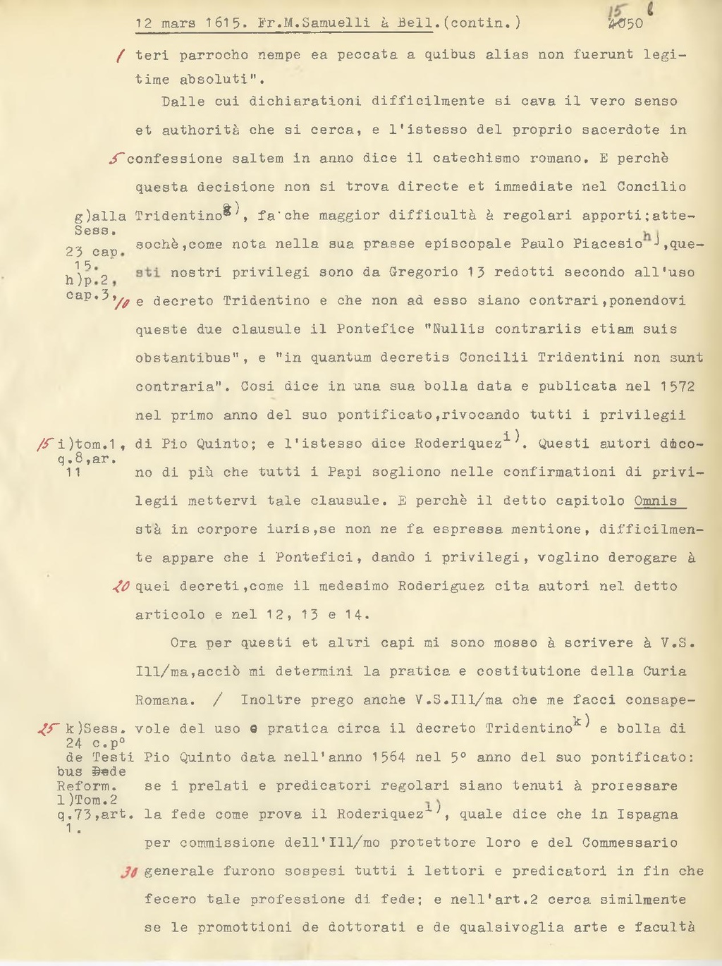 Ora per questi et altri capi mi sono mosso à scrivere à V.S. Ill.ma, acciò mi determini la practica e costitutione della della Curia Romana. Inoltre prego anche prego anche V.S. Ill.ma che me facci consapevole del uso e pratica circa il decreto Tridentino k) e bolla di Pio Quinto data nell'anno 1564 nel 5° anno del suo pontificato: se i prelati e predicatori regolari siano tenuti à professare la fede come prova il Roderiquez l), quale dice che in Ispagna per commissione dell'Ill.mo protettore loro e del Commessario generale furano sospesi tutti i lettori e predicatori in fin che fecero tale professione di fede; e nell'art.2 cerca similmente se le promottioni de dottorati e de qualsivoglia arte e facultá