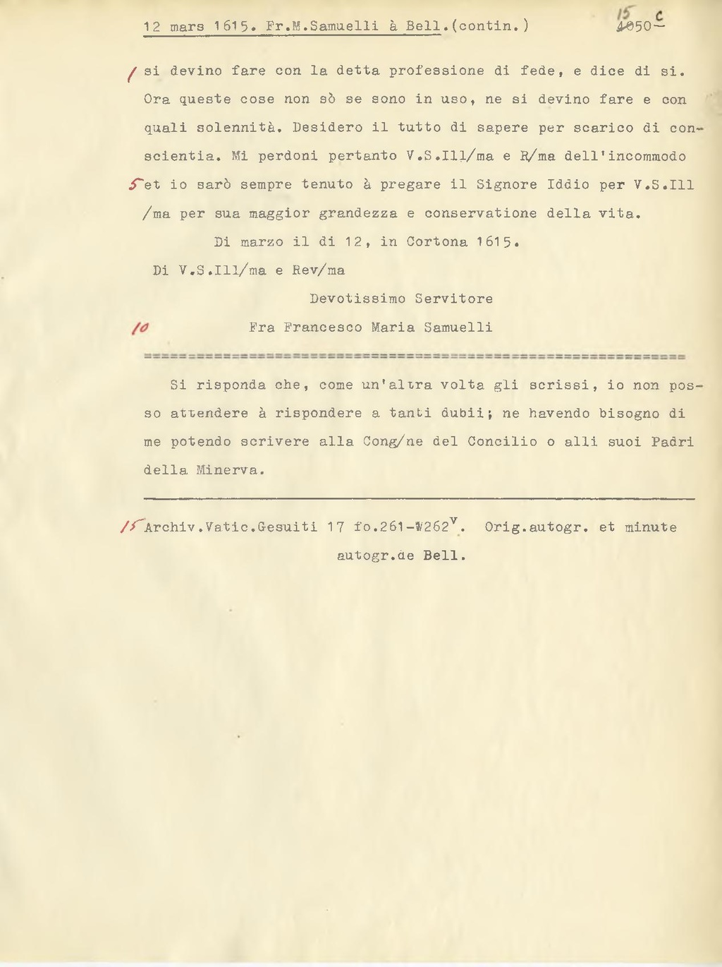 Si risponda che, come un'altra volta gli scrissi, io non posso attendere à rispondere a tanti dubii; ne havendo bisogno di me potendo scrivere alla Cong.ne del Concilio o alli suoi Padri della Minerva[1].