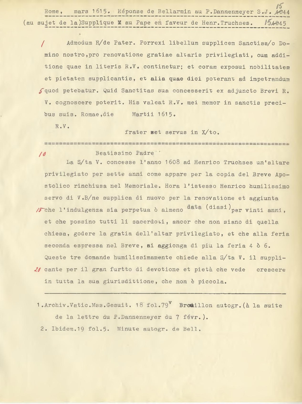 Beatissimo Padre La B.ta V. concesse l'anno 1608 ad Henrico Truchses un'altare privilegiato per sette anni come appare per la copia del Breve Apostolico rinchiusa nel Memoriale. Hora l'istesso Henrico humilissimo servo di V. B.ne supplica di nuovo per la renovatione et aggiunta che l'indulgenza sia perpetua ò almeno data (diasi) per vinti anni, et che possino tutti li sacerdoti, ancor che non siano di quella chiesa, godere la gratin dell'altar privilegiato, et che alla feria seconda espressa nel Breve, ai aggionga di piu la feria 4 ò 6.