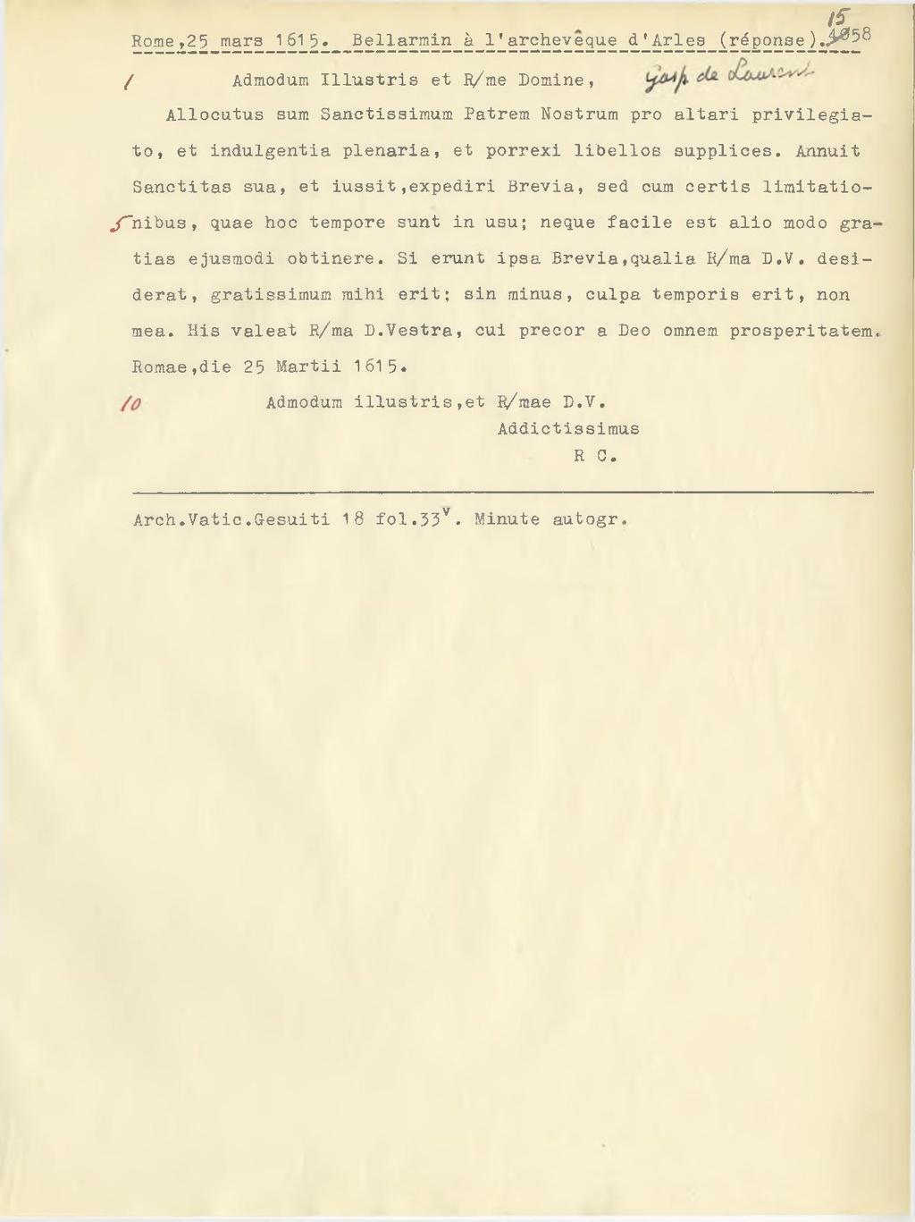 Allocutus sum Sanctissimum Patrem Nostrum pro altari privilegiato, et indulgentia plenaria, et porrexi libellos supplices. Annuit Sanctitas sua, et iussit, expediri Brevia, sed cum certis limitationibus, quae hoc tempore sunt in usu; neque facile est alio modo gratias ejusmodi obtinere. Si erunt ipsa Brevia, qualia R.ma D.V. desiderat, gratissimum mihi erit; sin minus, culpa temporis erit, non mea. His valeat R.ma D. Vestra, cui precor a Deo omnem prosperitatem.