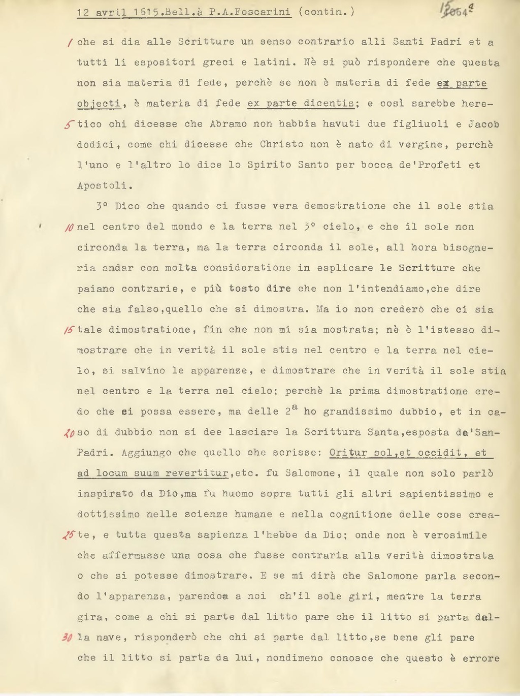 che si dia alle Scritture un senso contrario alli Santi Padri et a tutti li espositori greci e latini. Né si può rispondere che questa non sia materia di fede, perché se non é materia di fede ex parte objecti, é materia di fede ex parte dicentis; e così sarebbe heretico chi dicesse che Abramo non habbia havuti due figliuoli e Jacob dodici, come chi dicesse che Christo non é nato di vergine, perché l'uno e l'altro lo dice lo Spirito Santo per bocca de'Profeti et Apostoli.