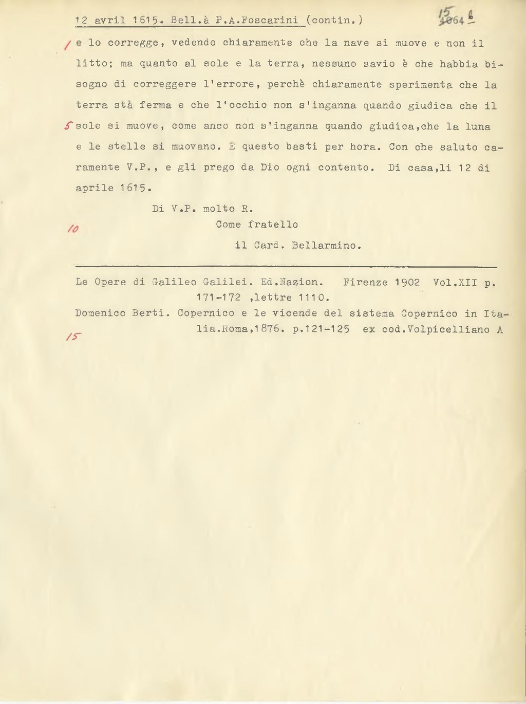 e lo corregge, vedendo chiaramente che la nave si muove e non il litto; ma quanto al sole e la terra, nessuno savio è che habbia bisogno di correggere l'errore, perchè chiaramente sperimenta che la terra stà ferma e che l'occhio non s'inganna quando giudica che il sole si muove, come anco non s'inganna quando giudica, che la luna e le stelle si muovano. E questo basti per hora. Con che saluto caramente V.P., e gli prego da Dio ogni contento. Di casa, li 12 di aprile 1615.