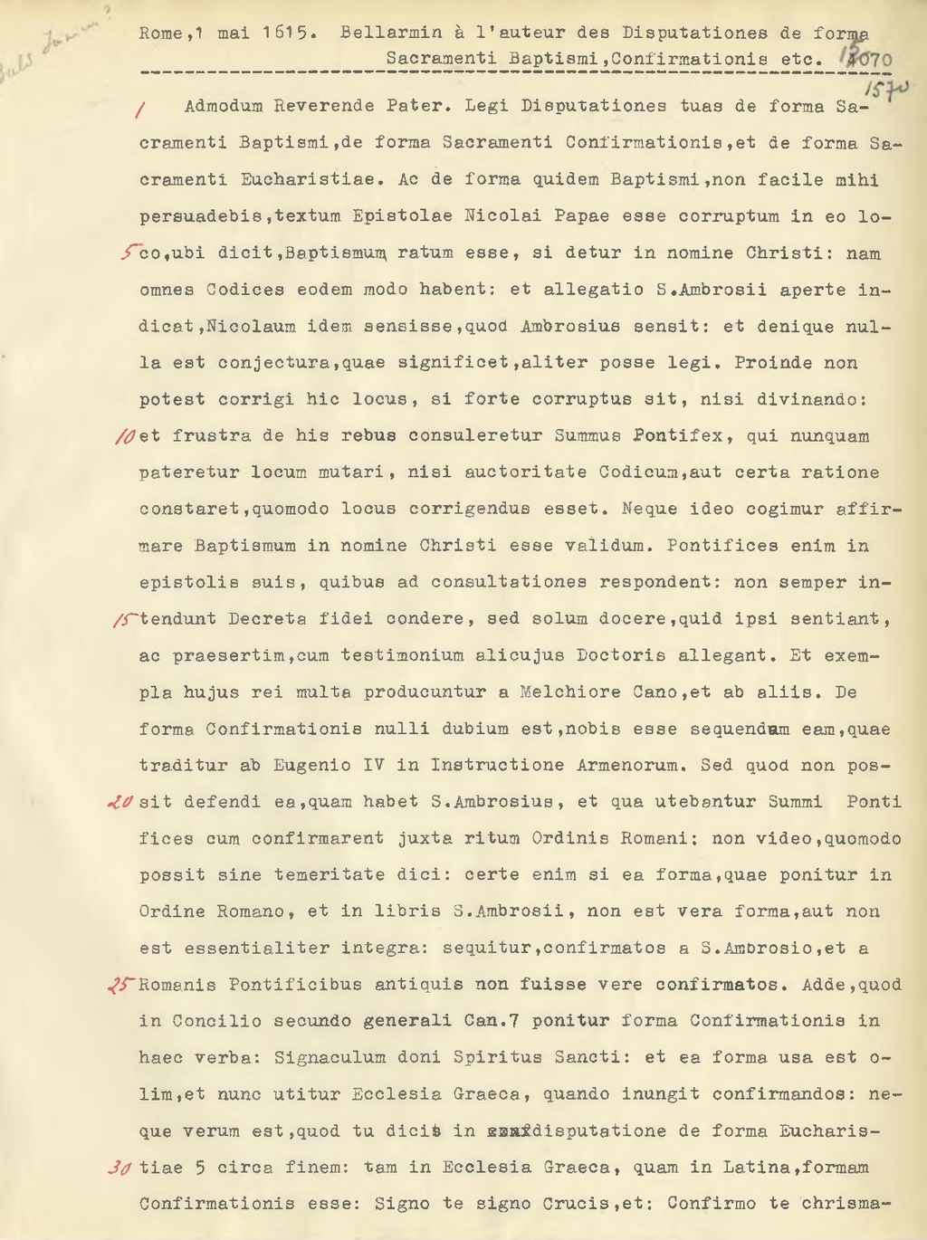 Admodum Reverende Pater. Legi Disputationes tuas de forma Sacramenti Baptismi, de forma Sacramenti Confirmationis, et de forma Sa cramenti Eucharistiae. Ac de forma quidem Baptismi, non facile mihi persuadebis, textum Epistolae Nicolai Papae esse corruptum in eo loco, ubi dicit, Baptismum ratum esse, si detur in nomine Christi: nam omnes Codices eodem modo habent: et allegatio S.Ambrosii aperte indicat, Nicolaum idem sensisse quod Ambrosius sensit: et denique nulla est conjectura,quae significet,aliter posse legi. Froinde non potest corrigi hic locus, si forte corruptus sit, nisi divinando:et frustra de his rebus consuleretur Summus Pontifex, qui nunquam pateretur locum mutari, nisi auctoritate Codicum, aut certa ratione constaret, quomodo locus corrigendus esset. Neque ideo cogimur affirmare Baptismum in nomine Christi esse validum. Pontifices enim in epistolis suis, quibus ad consultationes respondent: non semper intendunt Decreta fidei condere, sed solum decere, quid ipsi sentiant, ac praesertim, cum testimonium alicujus Doctoris allegant. Et exempla hujus rei multa producuntur a Melchiore Cano, et ab aliis. De forma Confirmationis nulli dubium est, nobis esse sequendam eam, quae traditur ab Eugenio IV in Instructione Armenorum. Sed quod non possit defendi ea, quam habet S. Ambrosius, et qua utebantur Summi Pontificee cum confirmarent juxta ritum Ordinis Romani; non video, quomodo possit sine temeritate dici: certe enim si ea forma, quae ponitur in Ordine Romano, et in libris S. Ambrosii, non est vera forma,aut non est essentialiter integra: sequitur, confirmatos a S. Ambrosio,et a Romanis Pontificibus antiquis non fuisse vere confirmatos. Adde, quod in Concilio seoundo generali Can.7 ponitur forma Confirmationis in haec verba: Signaculum doni Spiritus Sancti: et ea forma usa est olim, et nunc utitur Ecclesia Graeca, quando inungit confirmandos: ne que verum est, quod tu dicit in disputatione de forma Eucharistiae 5 circa finem: tam in Ecclesia Graeca, quam in Latina, formam Confirmationis esse: Signo te signo Crucis, et: Confirmo te chrismate
