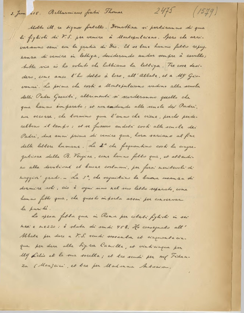 Molto ill.re Signor fratello. Domattina si partiranno di qua li figlioli di V.S. per venire à Montepulciano. Spero che arriveranno sano con la gratia di Dio. Et se bene hanno fatto repugnanza di venire in lettiga, desiderando andar sempre à cavallo: tutta via io ho voluto che abbiano la lettiga. Tre cose desidero, come anco l'ho detto à loro, all'Abbate, et a Ms Giovanni. La prima che costi a Montepulciano vadino alla scuola delli Padri Gesuiti, altrimenti si scorderanno quello che qua hanno imparato: et non andando alle scuole dei Padri non occorre, che tornino qua l'anno che viene, perche perderebbero il tempo:et se fussero andati costi alle scuole dei Padri, due anni prima di venire qua, hora sariano al fine delle lettere humane. La 2° che frequentino costi la congregatione della B. Vergine, come hanno fatto qua, et attendino alla devotione et buoni costumi, per farsi meritevoli di maggior grado. La 3°, che seguitino la buona usanza di dormire soli, cio è ogni uno nel suo letto separato, come hanno fatto qua, che questo importa assai conservar la purità.