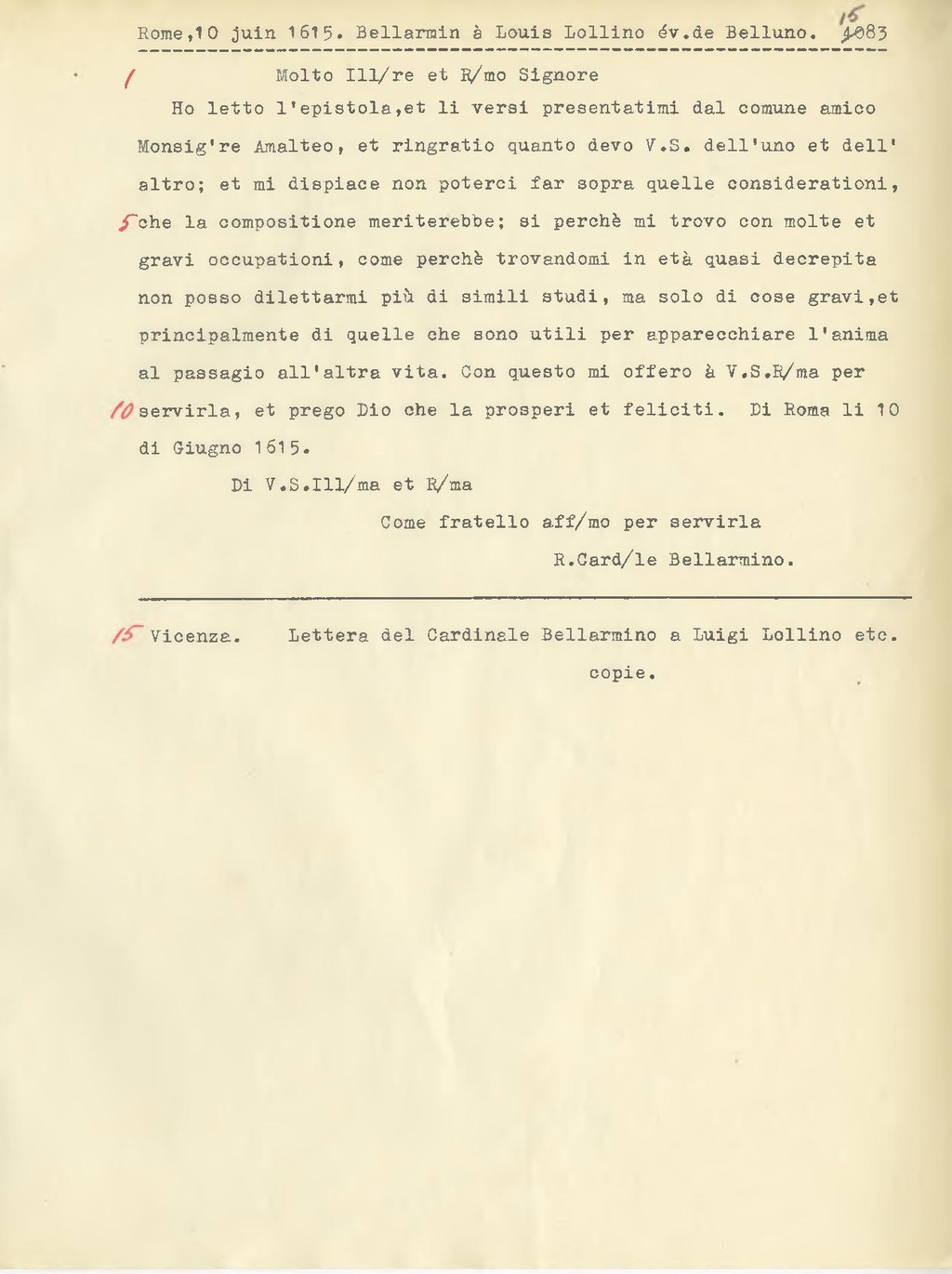 versi presentatimi dal comune amico Monsig're Amalteo, et ringratio quanto devo V.S. dell'uno et dell'altro; et mi dispiace non poterci far sopra quelle considerationi, che la compositione meriterebbe; si perché mi trovo con molte et gravi occupationi, come perché trovandomi in età quasi decrepita non posso dilettarmi più di simili studi, ma solo di solo di cose gravi,et principalmente di quelle che sono utili per apparecchiare l'anima al passagio all'altra vita. con questo mi offero à V.S. R.ma per servirla, et prego Dio che la prosperi et feliciti. Di Roma li 10 di Giugno 1615.