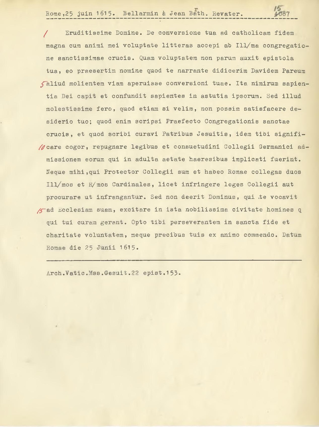 Eruditissime Domine. De conversione tua ad catholicam fidem magna cum animi mei voluptate litteras accepi ab Ill.ma congregatione sanctissimae crucis. Quam voluptatem non parum auxit epistola tua, eo praesertim nomine quod te narrante didicerim Davidem Pareum aliud molientem viam aperuisse conversioni tuae. Ita nimirum sapientia Dei capit et confundit sapientes in astutia ipsorum. Sed illud molestissime fero, quod etiam si velim, non possim satisfacere de siderio tuo; quod enim scripsi Praefecto Congregationis sanctae crucis, et quod scribi curavi Patribus Jesuitis, idem tibi significare cogor, repugnare legibus et consuetudini Collegii Germanici admissionem eorum qui in adulta astate haeresibus implicati fuerunt. Neque mihi, qui Protector Collegii sum et habeo Romae collegas duos Ill.mos et R.mos Cardinales, licet infringere leges Collegii aut procurare ut infrangantur. Sed non deerit Dominus, qui ie vocavit ad Ecclesiam suam, excitare in ista nobilissima civitate homines qui tui curam gerant. Opto tibi perseverantem in sancta fide et charitate voluntatem, meque precibus tuis ex animo commendo. Datum Romae die 25 Junii 1615 .