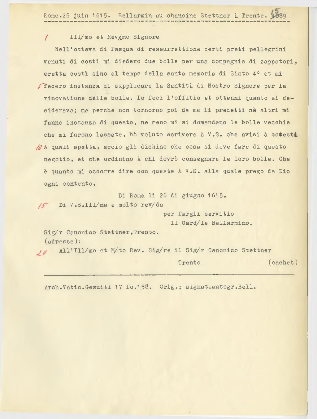 All'Ill.mo et M.to Rev. Sig.re il Sig.r Canonico Stettner