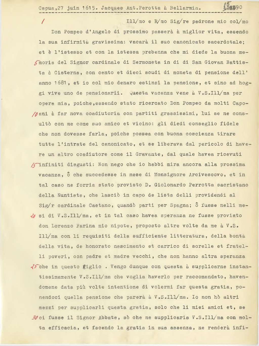 Don Pompeo d'Angelo di Prossimo passerà à miglior vita, essendo la sua infirmità gravissima: vacarà il suo canonicato sacerdotale; et è l'istesso et con la istessa prebenna che mi diede la buona memoria del Signor cardinale di Sermoneta in di {di} San Giovan Battista à Cisterna, con cento et dieci scudi di moneta di pensione dell'anno 1681, et io col mio denaro estinsi la pensione, et sino ad hoggi vive uno de pensionarii. Questa vacanza vene à V.S. Ill.ma per opera mia, poiche, essendo stato ricercato Don Pompeo da molti Capoani à far nova coadiutoria con partiti grassissimi, lui se ne consultò con me come suo amico et vicino: gli diedi conseglio fidele che non dovesse farla, poiche possea con buona coscienza tirare tutte l'intrate del canonicato, et se liberava dal pericolo di havere un altro coadiutore come il Gravante, dal quale havea ricevuti infiniti disgusti: Non nego che io habbi mira ancora alla prossima vacanza, ô che succedesse in mese di Monsignore Arcivescovo, et in tal caso ne forria stato provisto D. Giolonardo Perrotta sacristano della Nuntiata, che lasciò in capo de lista delli providendi al Sig.r Cardinale Caetano, quandò parti per Spagna; ô fusse nelli mesi di V.S. Ill.ma, et in tal caso havea speranza ne fusse provisto don Lorenzo Farina mio nipote, proposto altre volte da me à V.S. Ill.ma con il requisiti della sufficiente litteratura, della bontà della vita, de honorato nascimento et carrico di sorelle et fratelli poveri, con padre et madre vecchi, che non hanno altra speranza che in questo figlio. Vengo dunque con questa à supplicarne instantissimamente V.S.Ill.ma che voglia haverlo per raccomandato, havendomene data piú volte intentione di volermi far questa gratia, ponendoci quella pensione che parerà à V.S. Ill.ma. Io non hò altri mezzi per supplicarli questa gratia, solo che li miei amici et, se ci fusse il Signor Abbate, sò che ne supplicarlia V.S. Ill.ma con molta efficacia, et facendo la gratia in sua assenza, ne renderà infinite