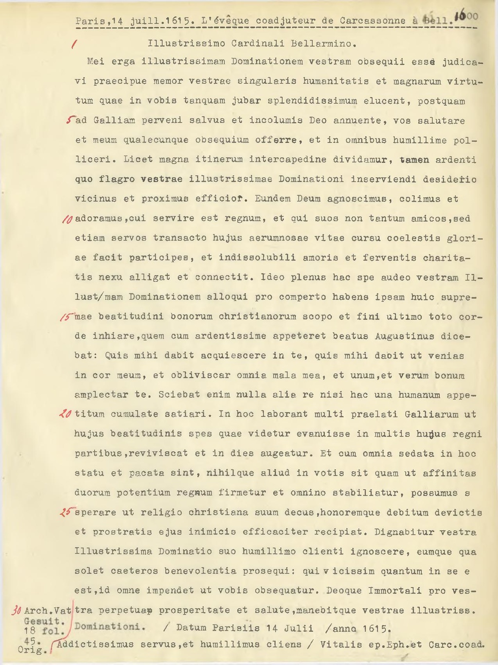 Mei erga illustrissimam Dominationem vestram obsequii esse judicavi praecipue memor vestrae singularis humanitatis et magnarum virtutum quae in vobis tanquam jubar splendidissimum elucent, postquam ad Galliam perveni salvus et incolumis Deo annuente, vos salutare et meum qualecunque obsequium offerre, et in omnibus humillime polliceri. Licet magna itinerum intercapedine dividamur, tamen ardenti quo flagro vestrae illustrissimae Dominationi inserviendi desiderio vicinus et proximus efficior. Eundem Deum agnoscimus, colimus et adoramus, cui servire est regnum, et qui suos non tantum amicos, ed etiam servos transatto hujus aerumnosae vitae cursu coelestis glori ne facit participes, et indissolubili amoris et ferventis charitatis nexu alligat et connectit. Ideo plenus hac spe audeo vestram illus.mam Dominationem alloqui pro comporto habens ipsam huio supremae beatitudini bonorum christianorum scopo et fini ultimo toto corde inhiare, quem cum ardentissime appeteret beatus Augustinus dicebat: Quis mihi dabit acquiescere in te, quis mihi dabit ut venias in cor meum, et obliviscar omnia mala mea, et unum, et verum bonum amplectar te. Sciebat enim nulla alia re nisi hac una humanum appetitum cumulate satiari. In hoc laborant multi praelati Galliarum ut hujus beatitudinis spes quae videtur evanuisse in multis hujus regni partibus, reviviscat et in dies augeatur. Et cum omnia sedata in hoc statu et pacata sint, nihilque aliud in votis sit quam ut affinitas duorum potentium regaum firmetur et omnino stabiliatur, possumus sperare ut religio Christiana suum decus, honoremque debitum devictis et prostratis ejus inimicis efficaciter recipiat. Dignabitur vestra Illustrissima Dominatio suo humillimo clienti ignoscere, eumque qua solet caeteros benevolentia prosequi: quivicissim quantum in se e est,id omne impendet ut vobis obsequatur. Deoque Immortali pro vestra perpetua prosperitate et salute, manebitque vestrae illustriss. Dominationi.