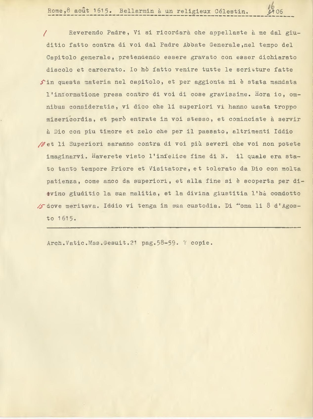 Reverendo Padre, Vi si ricorderà che appellaste à me dal giuditio fatto contra di voi dal Padre Abbate Generale, nel tempo del Capitolo generale, pretendendo essere gravato con esser dichiarato discolo et carcerato. Io ho fatto venire tutte le scritture fatte in questa materia nel capitolo, et per aggionta mi è stata mandata l'informatione presa contro di voi di cose gravissime. Hora io, omnibus consideratis, vi dico che li superiori vi hanno usata troppo misericordia, et però entrate in voi stesso, et cominciate à servirà Dio con piu timore et zelo che per il passato, altrimenti Iddio et li Superiori saranno contra di voi piu severi che voi non potete imaginarvi. Haverete visto l'infelice fine di N. il quale era stato tanto tempore Priore et Visitatore, et tolerato da Dio con molta patienza, come anco da superiori, et alla fine si è scoperta per divino giuditio la sua malitia, et la divina giustitia l'hà condotto dove meritava. Iddio vi tenga in sua custodia. Di Roma li 8 d'Agosto 1615.
