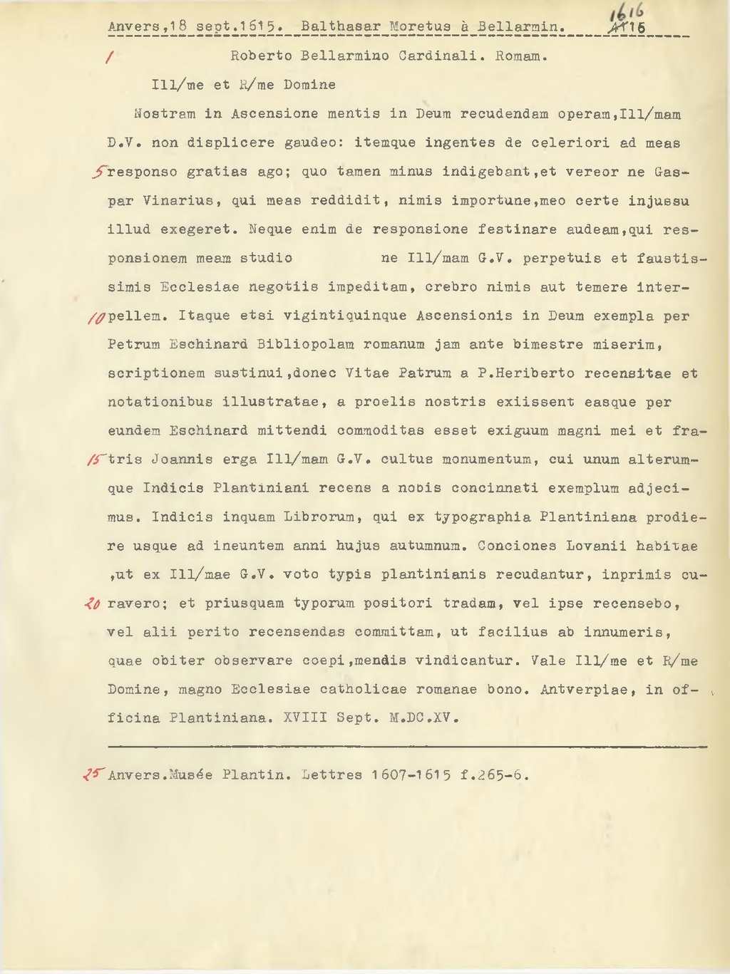 Petrum Eschinard Bibliopolam romanum jam ante bimestre miserim, scriptionem sustinui, donec Vitae Patrum a P.Heriberto recensitae et notationibus illustrarne, a proelis nostris exiissent easque per eundem Eschinard mittendi commoditas esset exiguum magni mei et fratris Joannis erga Ill.mam G.V. cultus monumentum, cui unum alterumque Indicis Plantiniani recens a nobis concinnati exemplum adjecimus. Indicis inquam Librorum, qui ex typographia Plantiniana prodie re usque ad ineuntem anni hujus autumnum. Conciones Lovanii habitae, ut ex Ill.mae G.V. voto typis plantinianis recudantur, inprimis curavero; et priusquam typorum ponitori tradam, vel ipse recensebo, vel alii perito recensendas committam, ut facilius ab innumeris, quae obiter observare coepi, mendis vindicantur. Vale Ill.me et R.me Domine, magno Ecclesiae catholicae romanae bono. Antverpiae, in officina Plantiniana. XVIII Sept. M.DC.XV.