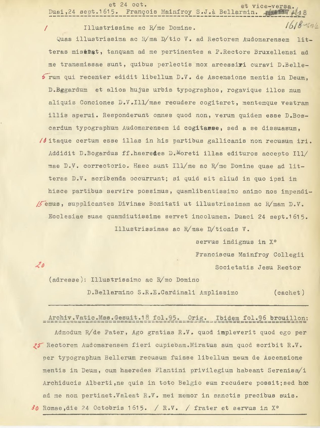 Admodum R.de Pater, Ago gratias R.V. quod impleverit quod ego per Rectorem Audomarensem fieri cupiebam. Miratus sum quod scribit R.V. per typographum Bellerum recusum fuisse libellum meum de Ascensione mentis in Deum, cum haeredes Plantini privilegium habeant Sereniss.i Archiducis Alberti,ne quis in toto Belgio eum recudere possit; sed hoc ad me non pertinet. Valeat R.V. mei memor in sanctis precibus suis.