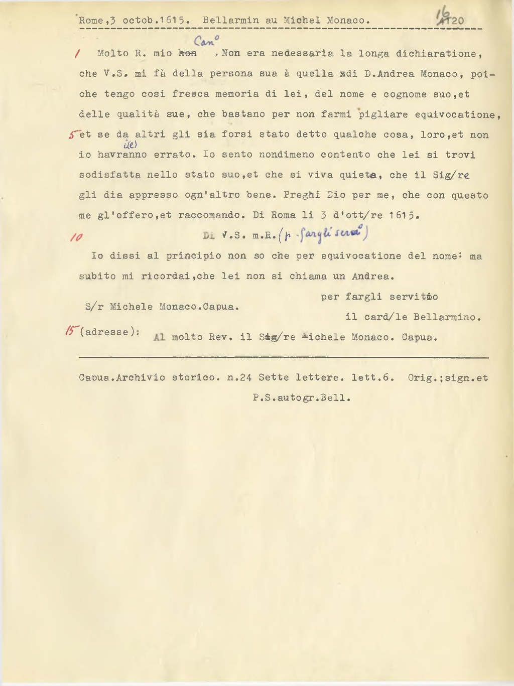 Molto R. mio Can.o, Non era necessaria la longa dichiaratione, che V.S. mi fà della persona sua à quella di D. Andrea Monaco, poiche tengo cosi fresca memoria di lei, del nome e cognome suo, et delle qualità sue, che bastano per non farmi pigliare equivocatione, et se da altri gli sia forsi stato detto qualche cosa, loro,et non io havranno errato. Io sento nondimeno contento che lei si trovi sodisfatta nello stato suo, et che si viva quieta, che il Sig.re gli dia appresso ogn'altro bene. Preghi Dio per me, che con questo me gl'offero, et raccomando. Di Roma li 3 d'ott.re 1615.