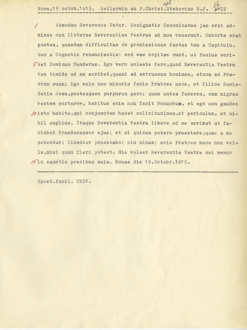 Admodum Reverende Pater. Resignatio Canonicatus jam erat admissa cum litterae Reverentiae Vestrae ad nos venerunt. Suborta erat postea, quaedam difficultas ob promissiones factas tum a Capitulo, tum a Cognatis renunciantis: sed eae sopitae sunt, ut fusius scribet Dominus Manderus. Ego vero moleste fero, quod Reverentia Vestra tam timide ad me scribat, quasi ad extraneum hominem, etnon ad Fratrem suum; Ego enim non minoris facio Fratres meos, et Filios Societatis Jesu, posteaquam purpuram gero; quam antea facerem, cum nigram vestem portarem, habitus enim non facit Monachum, et ego non gaudeo isto habitu, qui conjunctam habet solicitudinem, et periculum, et nihil amplius. Itaque Reverentia Vestra libere ad me scribat ut faciebat Praedecessor ejus; et si quidem poteri praestare, quae a me petentur; libenter praestabo: sin minus; scio Fratres meos non velle, nisi quod fieri potest. His valeat Reverentia Vestra mei memor in sanctis precibus suis. Romae die 15.0ctobr.1615.