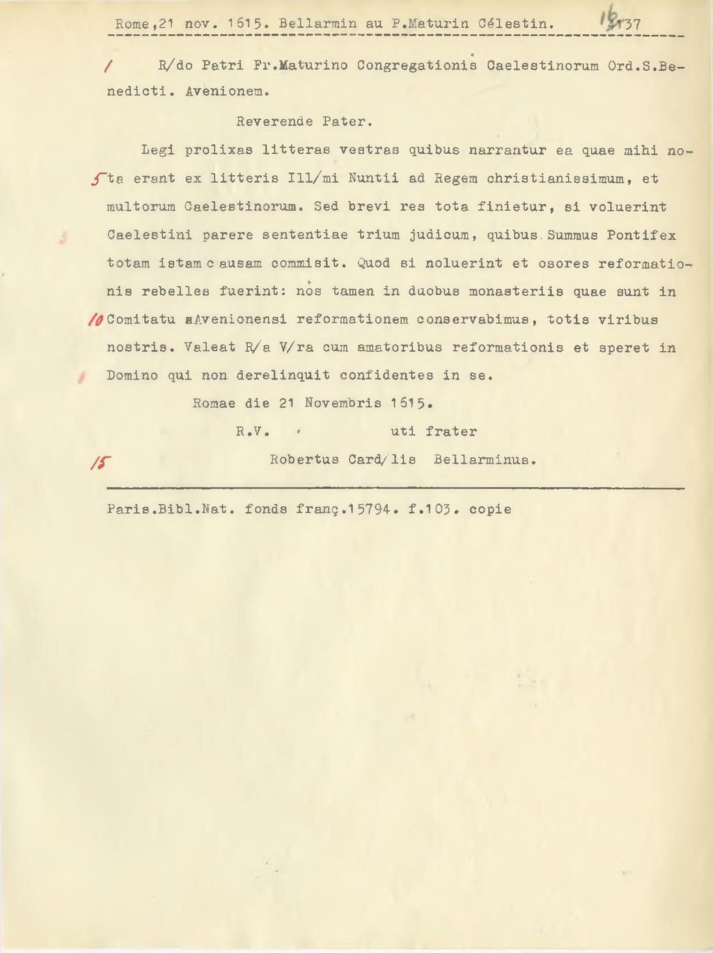 Legi prolixas litterae vestras quibus narrantur ea quae mihi nota erant ex litteris Ill.mi Nuntii ad Regem christianissimum, et multorum Caelestinorum. Sed brevi res tota finietur, si voluerint Caelestini parere sententiae trium judicum, quibus Summus Pontifex totam istam causam commisit. Quod si noluerint et osores reformationis rebelles fuerint: nos tamen in duobus monasteriis quae sunt in Comitatu Avenionensi reformationem conservabimus, totis viribus nostris. Valeat R.a V.ra cum amatoribus reformationis et speret in Domino qui non derelinquit confidentes in se.