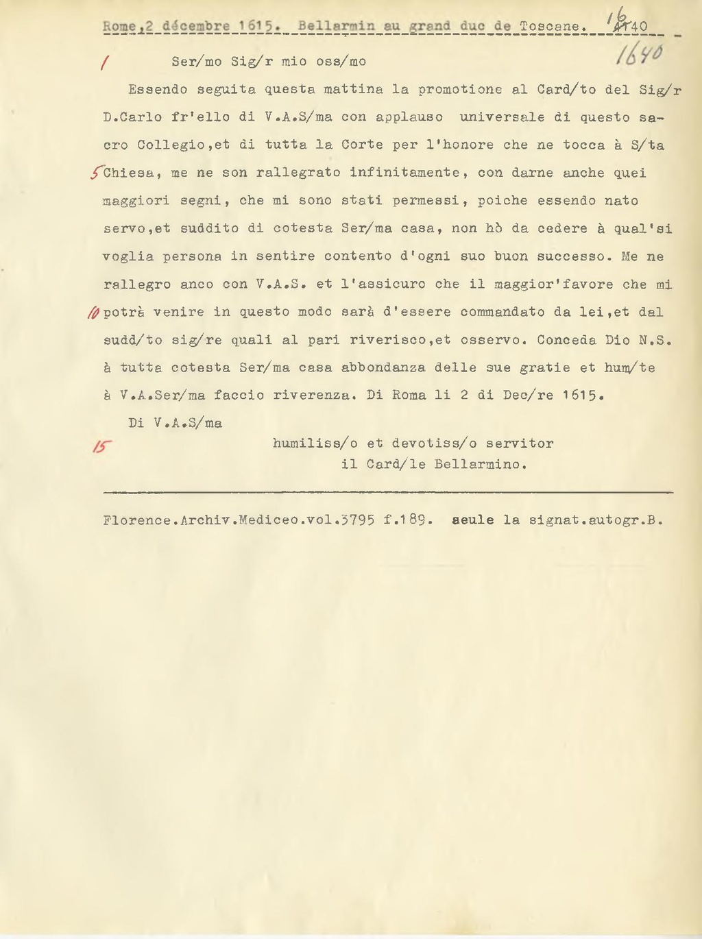 Essendo seguita questa mattina la promotione al Card.to del Sig.r D. Carlo fr'ello di V.A. S.ma con applauso universale di questo sacro Collegio, et di tutta la Corte per l'honore che ne tocca à S.ta Chiesa, me ne son rallegrato infinitamente, con darne anche quei maggiori segni, che mi sono stati permessi, poiche essendo nato servo, et suddito di cotesta Ser.ma casa, non hò da cedere à qual'si voglia persona in sentire contento d'ogni suo buon successo. Me ne rallegro anco con V.A.S. et l'assicuro che il maggior' favore che mi potrà venire in questo modo sarà d'essere commandato da lei, et dal sudd.to sig.re quali al pari riverisco, et osservo. Conceda Dio N.S. à tutta cotesta Ser.ma casa abbondanza delle sue gratie et hum.te à V.A. Ser.ma faccio riverenza. Di Roma li 2 di Dec.re 1615.