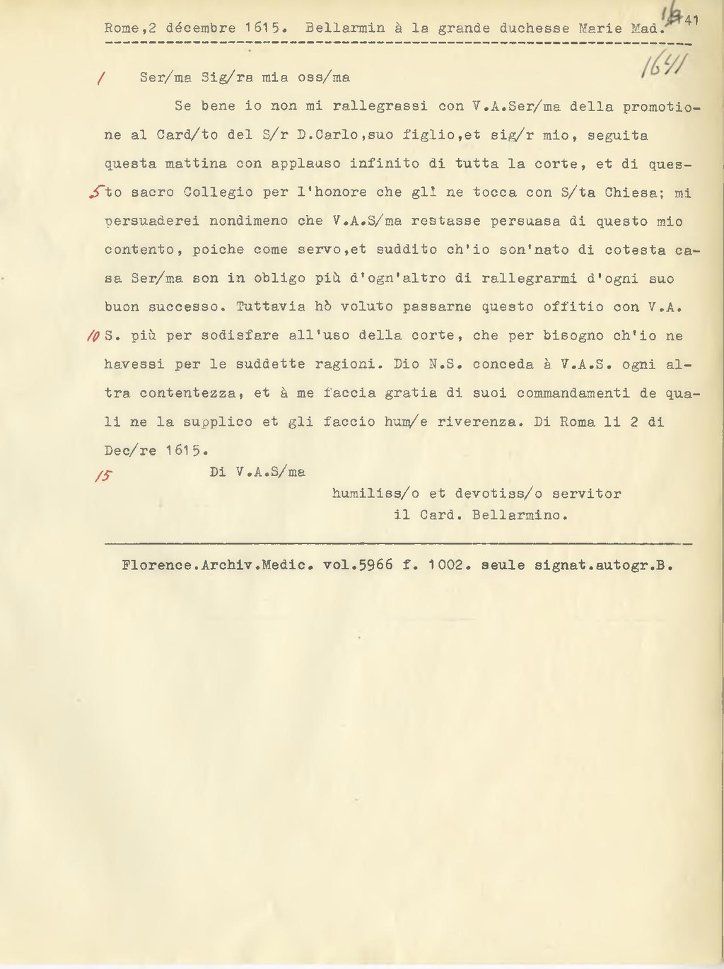 Se bene io non mi rallegrassi con V.A. Ser.ma della promotione al Card.to del S.r D. Carlo, suo figlio, et sig.r mio, seguita questa mattina con applauso infinito di tutta la corte, et di questo sacro Collegio per l'honore che gli ne tocca con S.ta Chiesa; mi persuaderei nondimeno che V.A.S.ma restasse persuasa di questo mio contento, poiche come servo, et suddito ch'io son'nato di cotesta casa Ser.ma son in obligo più d'ogn'altro di rallegrarmi d'ogni suo buon successo. Tuttavia hò voluto passarne questo offitio con V.A.S. più per sodisfare all'uso della corte, che per bisogno ch'io ne havessi per le suddette ragioni. Dio N.S. conceda à V.A.S. ogni altra contentezza, et à me faccia gratia di suoi commandamenti de quali ne la supplico et gli faccio hum.e riverenza. Di Roma li 2 di Dec.re 1615.