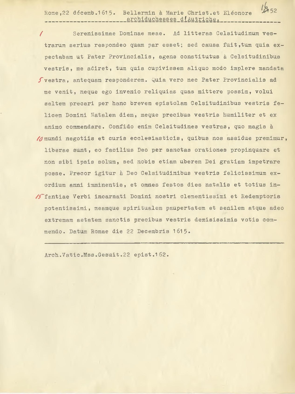 Serenissimae Dominae meae. Ad litteras Celsitudinum vestrarum serius respondeo quam par esset; sed causa fuit,tum quia expectabam ut Pater Provincialis, agens constitutus à Celsitudinibus vestris, me adiret, tum quia cupivissem aliquo modo implere mandata vestra, antequam responderem. Quia vero nec Pater Provincialis ad me venit, neque ego invenio reliquias quas mittere possim, volui saltem precari per hanc brevem epistolam Celsitudinibus vestris felicem Domini Natalem diem, meque precibus vestris humiliter et ex animo commendare. Confido enim Celsitudines vestras, quo magis à mundi negotiis et curis ecclesiasticis, quibus nos assidue premimur, liberae sunt, eo facilius Deo per sanctas orationes propinquare et non sibi ipsis solum, sed nobis etiam uberem Dei gratiam impetrare posse. Precor igitur à Deo Celsitudinibus vestris felicissimum exordium anni imminentis, et omnes festos dies natalis et totius infantiae Verbi incarnati Domini nostri clementissimi et Redemptoris potentissimi, meamque spiritualem paupertatem et senilem atque adeo extremam aetatem sanctis precibus vestris demisissimis votis commendo. Datum Romae die 22 Decembris 1615.