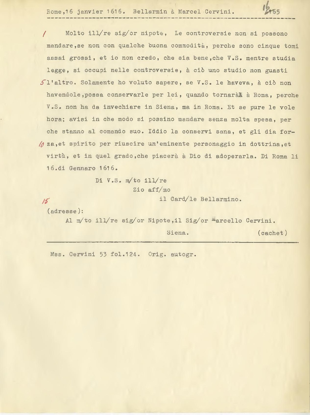Molto ill.re sig.or nipote, Le controversie non si possono mandare, se non con qualche buona commodità, perche sono cinque tomi assai grossi, et io non credo, che sia bene, che V.S. mentre studia legge, si occupi nelle controversie, à ciò che uno studio non guasti l'altro. Solamente ho voluto sapere, se V.S. le haveva, à ciò non havendole possa conservarle per lei, quando tornarà a Roma, perch V.S. non ha da invechiare in Siena, ma in Roma. Et se pure le vole hora; avisi in che modo si possino mandare senza molta spesa, perche stanno al comando suo. Iddio la conservi sana, et gli dia forza, et spirito per riuscire un'eminente personaggio in dottrina, et virtù, et in quel grado, che piacerà à di Dio di adoperarla. Di Roma li 16. di Gennaro 1616.