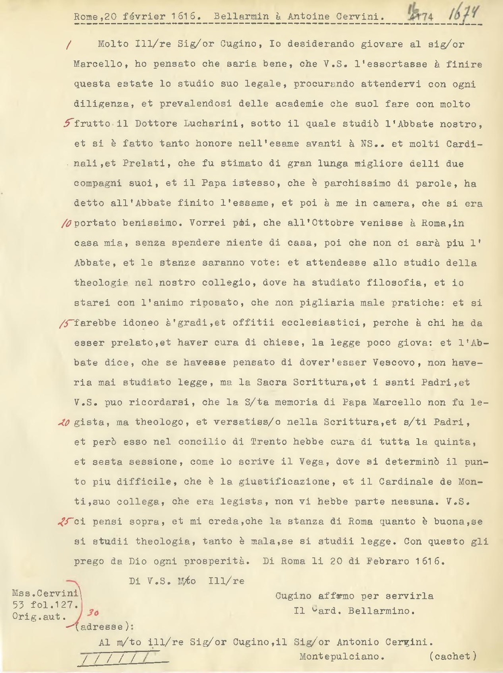 Molto Ill.re Sig.or Cugino, Io desiderando giovare al sig.or Marcello, ho pensato che saria bene, che V.S. l'essortasse à finire questa estate lo studio suo legale, procurando attendervi con ogni diligenza, et prevalendosi delle academie che suol fare con molto frutto il Dottore Lucharini, sotto il quale studiò l'Abbate nostro, et si è fatto tanto honore nell'esame avanti à NS.. et molti Cardinali, et Prelati, che fu stimato di gran lunga migliore delli due compagni suoi, et il Papa istesso, che è parchissimo di parole, ha detto all'Abbate finito l'essame, et poi à me in camera, che si era portato benissimo. Vorrei poi, che all'Ottobre venisse à Roma, in casa mia, senza spendere niente di casa, poi che non ci sarà più l'Abbate, et le stanze saranno vote: et attendesse allo studio della theologia nel nostro collegio, dove ha studiato filosofia, et io starei con l'animo riposato, che non pigliaria male pratiche: et si farebbe idoneo à'gradi, et offitii ecclesiastici, perche à chi ha da esser prelato, et haver cura di chiese, la legge poco giova: et l'Abbate dice, che se havesse pensato di dover'esser Vescovo, non haveria mai studiato legge, ma la Sacra Scrittura, et i santi Padri, et V.S. puo ricordarsi, che la S.ta memoria di Papa Marcello non fu legista, ma theologo, et versatiss.o nella Scrittura, et a.ti Padri, et però esso nel concilio di Trento hebbe cura di tutta la quinta, et sesta sessione, come lo scrive il Vega, dove si determinò il punto piu difficile, che è la giustificazione, et il Cardinale de Monti, suo collega, che era legista, non vi hebbe parte nessuna. V.S. ci pensi sopra, et mi creda, che la stanza di Roma quanto è buona, se si studii theologia, tanto è mala, se si studii legge. Con questo gli prego da Dio ogni prosperità. Di Roma li 20 di Febraro 1616.