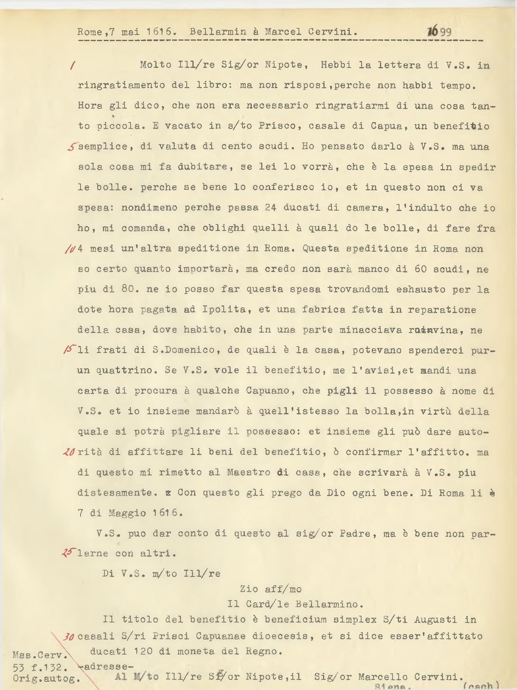Molto Ill.re Sig.or Nipote, Hebbi la lettera di V.S. in ringratiamento del libro: ma non risposi, perche non habbi tempo. Hora gli dico, che non era necessario ringratiarmi di una cosa tanto piccola. E vacato in s.to Prisco, casale di Capua, un benefitio semplice, di valuta di cento scudi. Ho pensato darlo a V.S. ma una sola cosa mi fa dubitare, se lei lo vorrà, che è la spesa in spedir le bolle, perche se bene lo conferisco io, et in questo non ci va spesa: nondimeno perche passa 24 ducati di camera, l'indulto che io ho, mi comanda, che oblighi quelli à quali do le bolle, di fare fra 4 mesi un'altra speditione in Roma. Questa speditione in Roma non so certo quanto importarà, ma credo non sarà manco di 60 scudi, ne piu di 80. ne io posso far questa spesa trovandomi eshausto per la dote hora pagata ad Ipolita, et una fabrica fatta in reparatione della casa, dove habito, che in una parte minacciava rovina, ne li frati di S. Domenico, de quali è la casa, potevano spenderci purun quattrino. Se V.S. vole il benefitio, me l'avisi, et mandi una carta di procura à qualche Capuano, che pigli il possesso à nome di V.S. et io insieme mandarò à quell'istesso la bolla, in virtù della quale si potrà pigliare il possesso: et insieme gli può dare autorità di affittare li beni del benefitio, ò confirmar l'affitto, ma di questo mi rimetto al Maestro di casa, che scrivarà à V.S. piu distesamente. Con questo gli prego da Dio ogni bene. Di Roma li 7 di Maggio 1616.