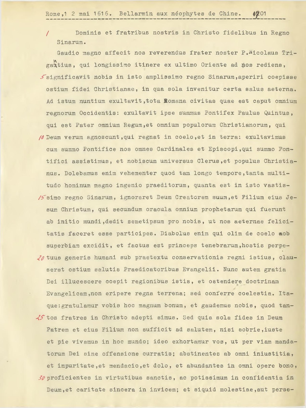 Gaudio magno affecit nos reverendus frater noster P. Nicolaus Trigantius, qui longissimo itinere ex ultimo Oriente ad hos rediens, significavit nobis in isto amplissimo regno Sinarum, aperiri coepisse ostium fidei Christianae, in qua sola invenitur certa salus aeterna. Ad istum nuntium exultavit, tota Romana civitas quae est caput omnium regnorum Occidentis: exultavit ipse summus Pontifex Paulus Quintus, qui est Pater omnium Regum, et omnium populorum Christianorum, qui Deum verum agnoscunt, qui regnai in coelo, et in terra: exultavimus cum summo Pontifica nos omnes Cardinales et Episcopi, qui summo Pontifici assistimus, et nobiscum universus Clerus, et populus Christianus. Dolebamus enim vehementer quod tam longo tempore, tanta multitudo hominum magno ingenio praeditorum, quanta est in isto vastissimo regno Sinarum, ignorerei Deum Creatorem suum, et Filium eius Jesum Christum, qui secundum oracula omnium prophetarum qui fuerunt ab initio mundi, dedit semetipsum pro nobis, ut nos aeternae felicitatis faceret esse participes. Diabolus enim qui olim de coelo aob superbiam excidit, et factus est princeps tenebrarum, hostis perpetuus generis humani sub praetextu conservationis regni istius, clauserat ostium salutis Praedicatoribus Evangelii. Nunc autem gratin Dei illucescere ooepit regionibus istis, et estendere doctrinam Evangelicam, non eripere regna terrena; sed conferre coelestia. Itaque: gratulamur vobis hoc magnum bonum, et gaudemus nobis, quod tantos fratres in Christo adepti simus. Sed quia sola fides in Deum Patrem et eius Filium non sufficit ad salutem, nisi sobrie, iuste et pie vivamus in hoc mundo; ideo exhortamur vos, ut per viam mandatorum Dei sine offensione curratis; abstinentes ab omni iniustitia, et impuritate, et mendacio, et dolo, et abundantes in omni opere bono, proficientes in virtutibus sanctis, ac potissimum in confidentia in Deum, et caritate sincera in invicem; et siquid molestiae, aut persecutionis