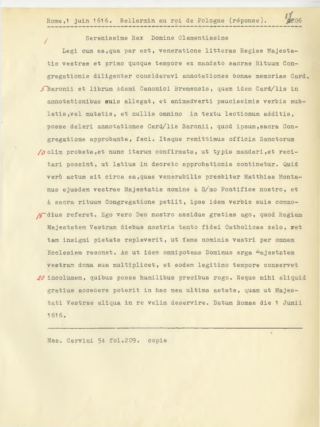 Legi cum ea, qua par est, veneratione litteras Regiae Majestatis vestrae et primo quoque tempore ex mandato sacrae Rituum Congregationis diligenter consideravi annotationes bonae memoriae Card.Baronii et librum Adami Canonici Bremensis, quem idem Card.lis in annotationibus suis allegai, et animadverti paucissimis verbis sublatis, vel mutatis, et nullis omnino in textu lectionum additis, posse deleri annotationes Card.lis Baronii, quod ipsum, sacra Congregatione approbante, feci. Itaque remittimus officia Sanctorum olim probata, et nunc iterum confirmata, ut typis mandari, et recitari possint, ut latius in decreto approbationis continetur. Quid verò actum sit circa ea, quae venerabilis presbiter Matthias Montanus ejusdem vestrae Majestatis nomine à S.mo Pontifice nostro, et à sacra rituum Congregatione petiit, ipse idem verbis suis commodius referet. Ego vero Deo nostro assidue gratias ago, quod Regiam Majestatem Vestram diebus nostris tanto fidei Catholicae zelo, et tam insigni piotate repleverit, ut fama nominis vostri per omnem Ecclesiam resonet. Ac ut idem omnipotens Dominus erga ajestatem vestram dona sua multiplicet, et eodem legitimo tempore conservet incolumem, quibus posse humilibus precibus rogo. Neque mihi aliquid gratius accedere poterit in hac mea ultima aetate, quam ut Majestati Vestrae aliqua in re velim deservire. Datum Romae die 1 Junii 1616.