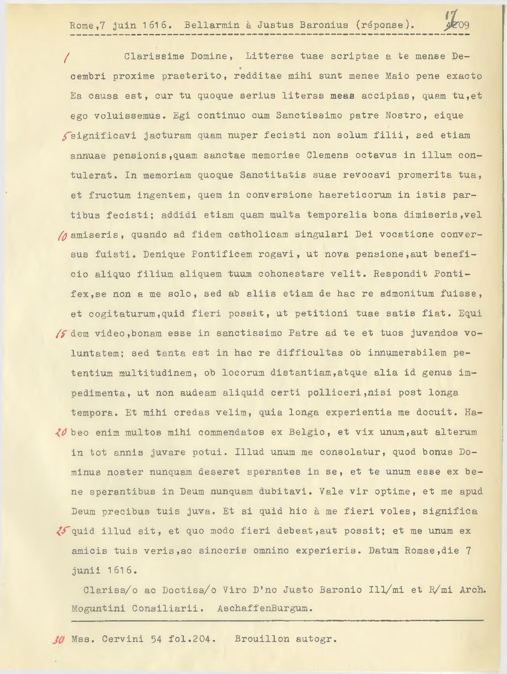 Clarissime Domine, Litterae tuae scriptae a te mense De cembri proxime praeterito, redditae mihi sunt mense Maio pene exacto Ea causa est, cur tu quoque serius literas meas accipias, quam tu, et ego voluissemus. Egi continuo cum Sanctissimo patre Nostro, eique significavi jacturam quam nuper fecisti non solum filii, sed etiam annuae pensionis, quam sanctae memorine Clemens octavus in illum contulerat. In memoriam quoque Sanctitatis suae revocavi promerita tua, et fructum ingentem, quem in conversione haereticorum in istis partibus fecisti; addidi etiam quam multa temporalia bona dimiseris, vel amiseris, quando ad fidem catholicam singulari Dei vocatione conversus fuisti. Denique Pontificem rogavi, ut nova pensione, aut beneficio aliquo filium aliquem tuum cohonestare velit. Respondit Pontifex, se non a me solo, sed ab aliis etiam de hac re admonitum fuisse, et cogitaturum, quid fieri possit, ut petitioni tuae satis fiat. Equidem video, bonam esse in sanctissimo Patre ad te et tuos juvandos voluntatem; sed tanta est in hac re difficultas ob innumerabilem petentium multitudinem, ob locorum distantiam, atque alia id genus impedimenta, ut non audeam aliquid certi polliceri, nisi post longa tempora. Et mihi credas velim, quia longa experientia me docuit. Habeo enim multos mihi commendatos ex Belgio, et vix unum, aut alterum in tot annis juvare potui. Illud unum me consolatur, quod bonus Dominus noster nunquam deseret sperantes in se, et te unum esse ex be ne sperantibus in Deum nunquam dubitavi. Vale vir optime, et me apud Deum precibus tuis juva. Et si quid hic à me fieri voles, significa quid illud sit, et quo modo fieri debeat, aut possit; et me unum ex amicis tuis veris, ac sinceris omnino experieris. Datum Romae, die 7 junii 1616.