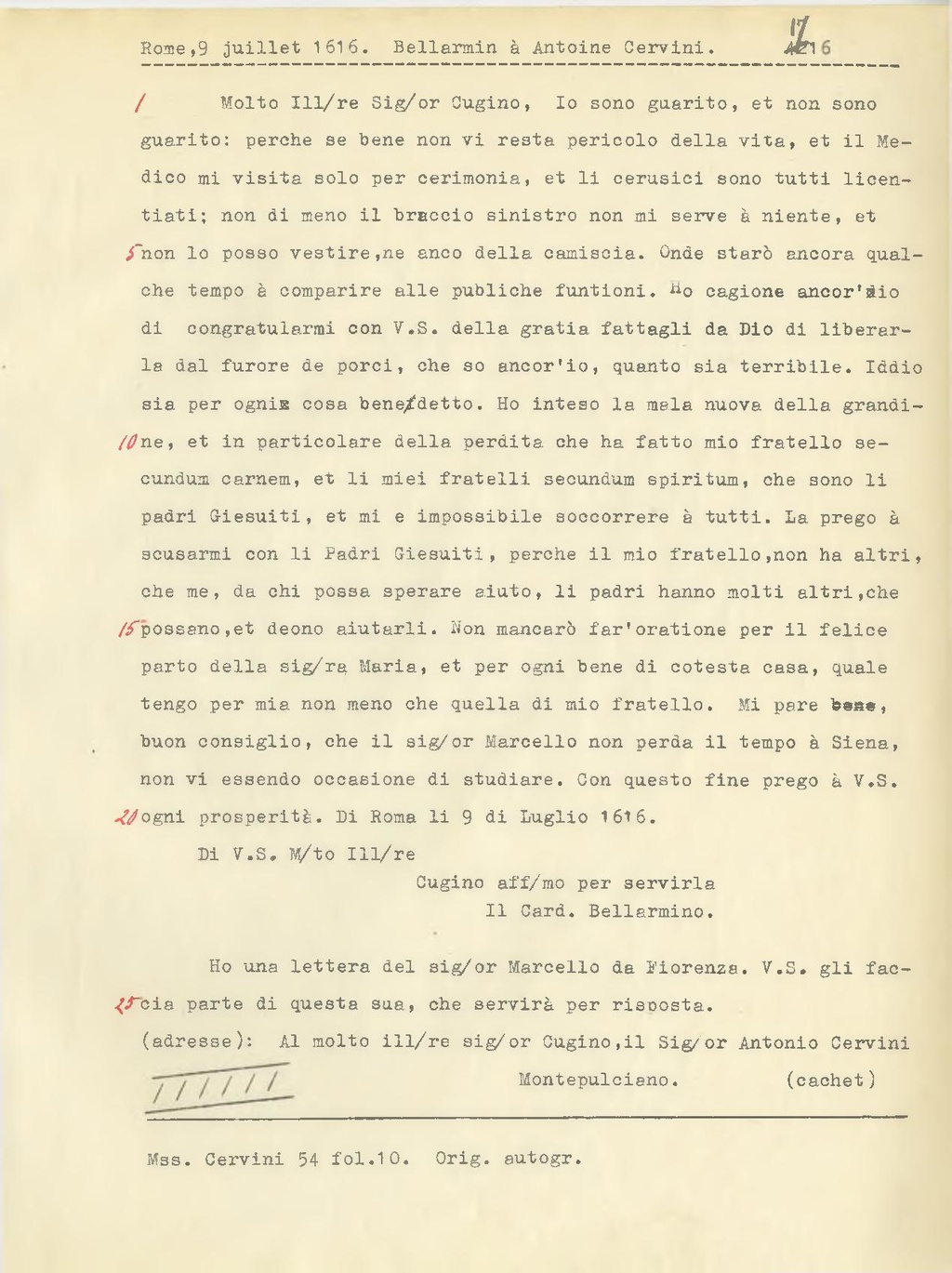 Molto Ill.re Sig.or Cugino, Io sono guarito, et non sono guarito: perche se bene non vi resta pericolo della vita, et il Me dico mi visita solo per cerimonia, et li cerusici sono tutti licentiati; non di meno il braccio sinistro non mi serve à niente, et non lo posso vestire, ne anco della camiscia. Onde starò ancora qual che tempo à comparire alle publiche funtioni. ho cagione ancor'dio di congratularmi con V.S. della gratia fattagli da Dio di liberar la dal furore de porci, che so ancor'io, quanto sia terribile. Iddio sia per ogni cosa benedetto. Ho inteso la mala nuova della grandine, et in particolare della perdita che ha fatto mio fratello secundum carnem, et li miei fratelli seoundum spiritum, che sono li padri Giesuiti, et mi e impossibile soccorrere à tutti. La prego à scusarmi con li Padri Giesuiti, perche il mio fratello, non ha altri, che me, da chi possa sperare aiuto, li padri hanno molti altri, che possano, et deono aiutarli. Non mancarò far'oratione per il felice parto della sig.ra Maria, et per ogni bene di cotesta casa, quale tengo per mia non meno che quella di mio fratello. Mi pare ben, buon consiglio, che il sig.or Marcello non perda il tempo à Siena, non vi essendo occasione di studiare. Con questo fine prego à V.S. ogni prosperità. Di Roma li 9 di Luglio 1616.