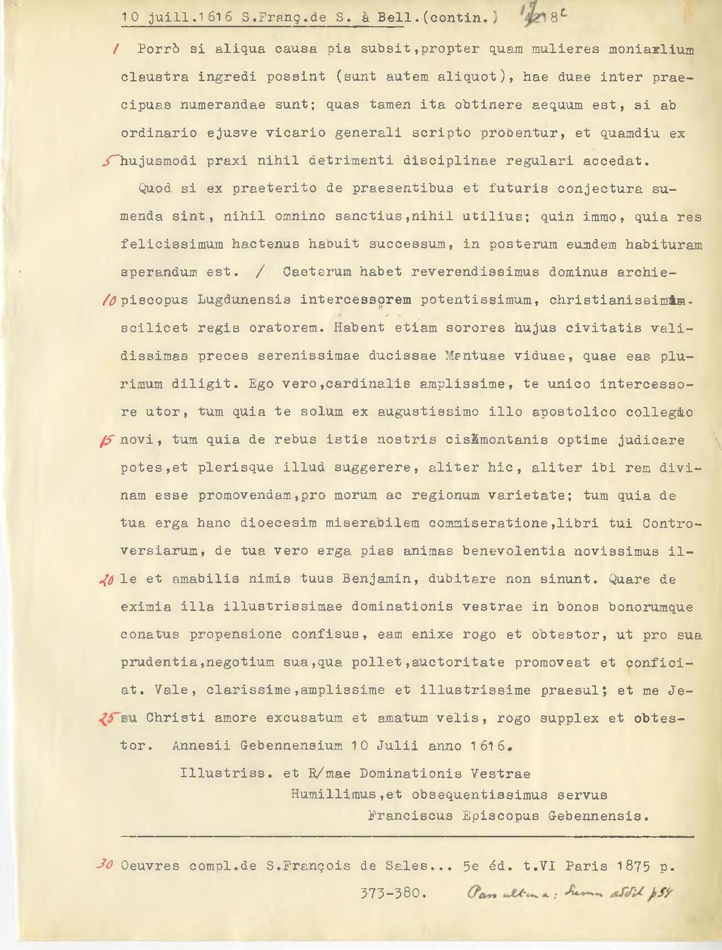 conatus propensione confisus, eam enixe rogo et obtestor, ut pro sua prudentia, negotium sua,qua pollet, auctoritate promoveat et conficiat. Vale, alarissime, amplissime et illustrissime praesul; et me Jesu Christi amore excusatum et amatum velia, rogo supplex et obtestor. Annesti Gebennensium 10 Julii anno 1616.
