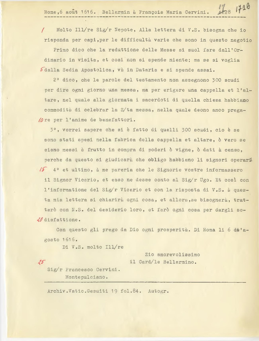 Con questo gli prego da Dio ogni prosperità. Di Roma li 6 d'agosto 1616.