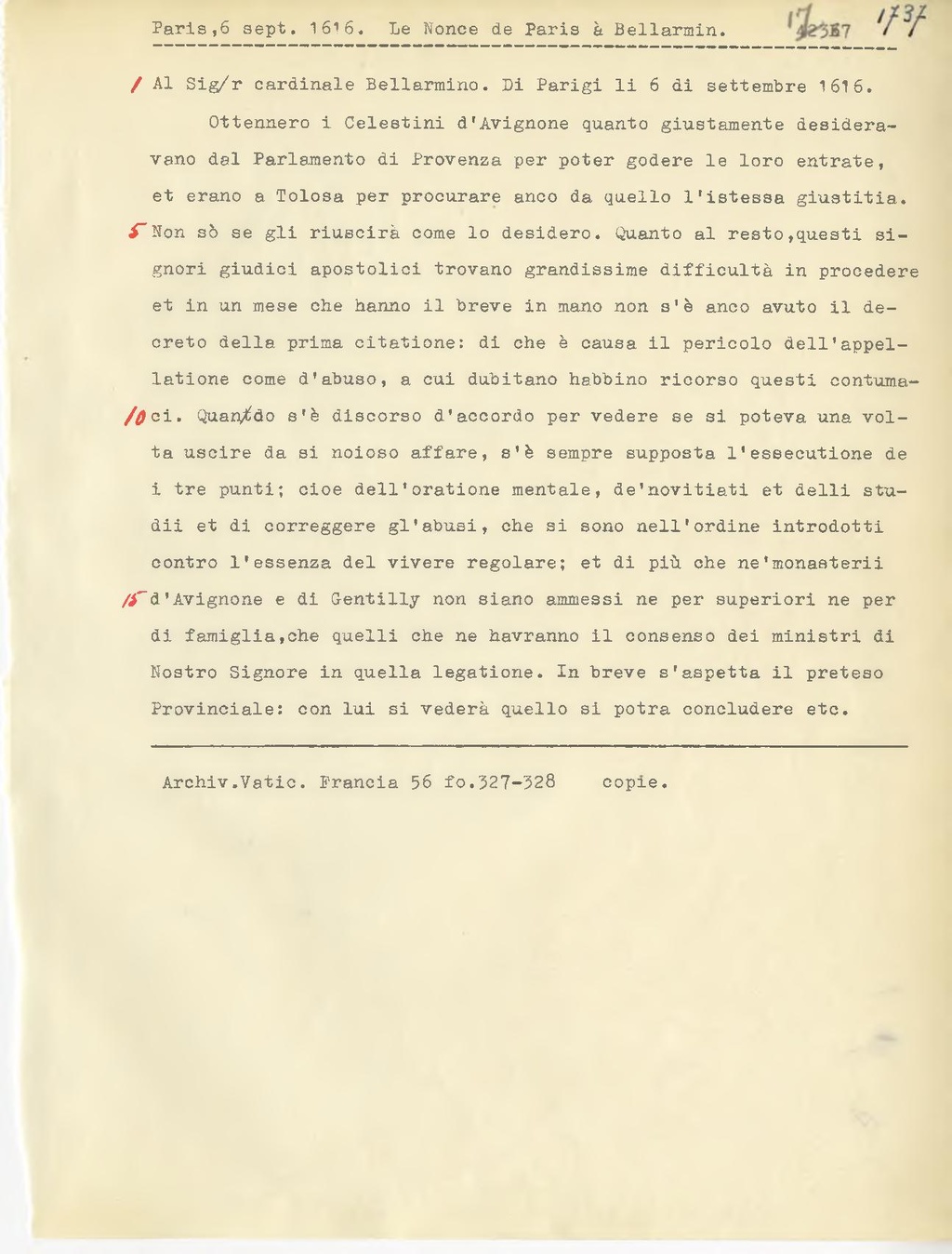 Al Sig.r cardinale Bellarmino. Di Parigi li 6 di settembre 1616.