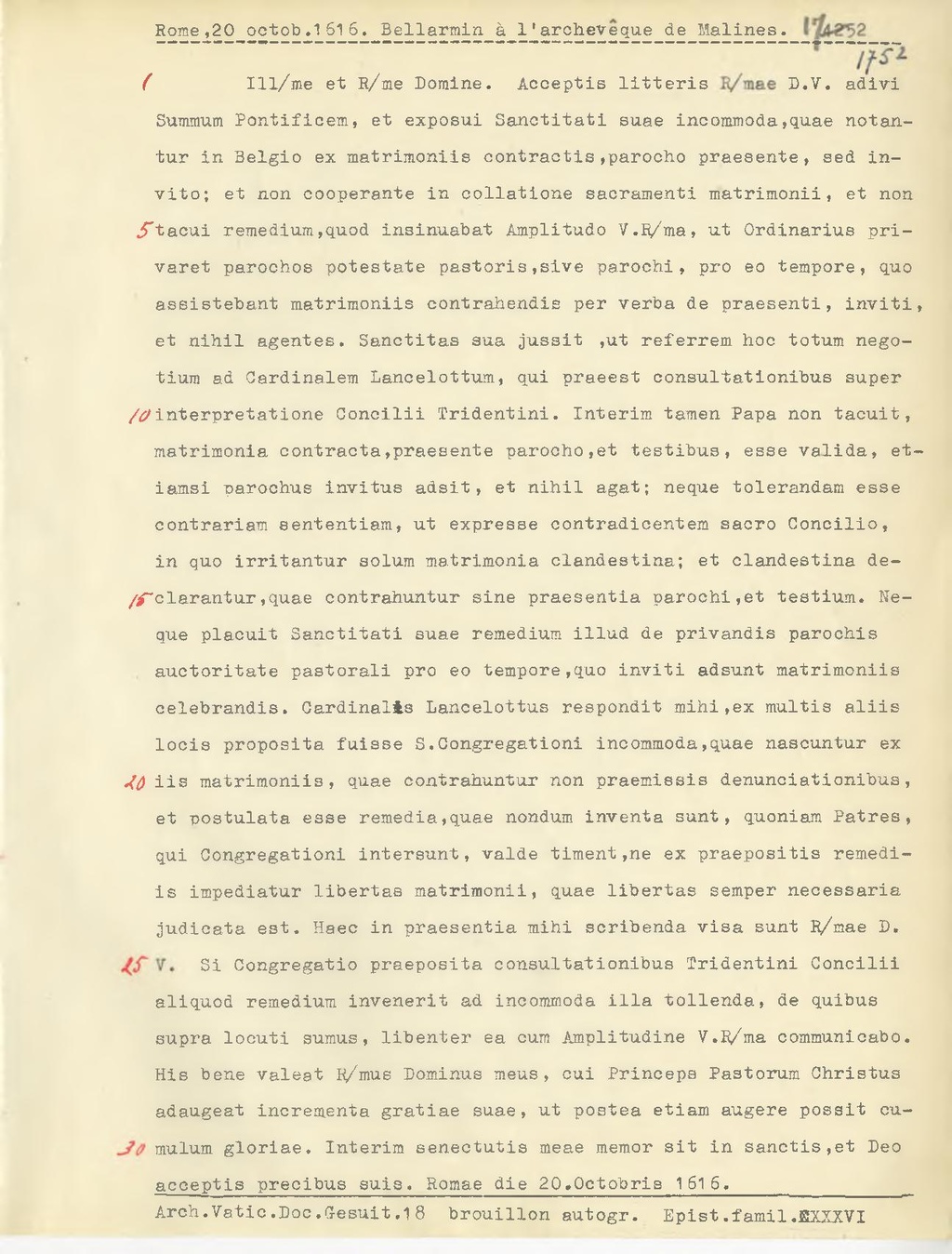 Summum Pontificem, et exposui Sanctitati suae incommoda, quae notantur in Belgio ex matrimoniis contractis, parocho praesente, sed invito; et non cooperante in collatione sacramenti matrimonii, et non tacui remedium, quod insinuabat Amplitudo V. B.ma, ut Ordinarius privaret parochos potestate pastoria, sive parochi, pro eo tempore, quo assistebant matrimoniis contrahendia per verba de praesenti, inviti, et nihil agentes. Sanctitas sua jussit, ut referrem hoc totum negotium ad Cardinalem Lancelottum, qui praeest consultationibus super interpretatione Concilii Tridentini. Interim tamen Papa non tacuit, matrimonia contracta, praesente parocho, et testibus, esse valida, etiamsi parochus invitus adsit, et nihil agat; neque tolerandam esse contrariam sententiam, ut expresse contradicentem sacro Concilio, in quo irritantur solum matrimonia clandestina; et clandestina declarantur, quae contrahuntur sine praesentia parochi, et testium. Neque placuit Sanctitati suae remedium illud de privandis parochis auctoritate pastorali pro eo tempore, quo inviti adsunt matrimoniis celebrandis. Cardinalis Lancelottus respondit mihi, ex multis aliis locis proposita fuisse S. Congregationi incommoda, quae nascuntur ex iis matrimoniis, quae contrahuntur non praemissis denunciationibus, et postulata esse remedia,quae nondum inventa sunt, quoniam Patres, qui Congregationi intersunt, valde timent, ne ex praepositis remediis impediatur libertas matrimonii, quae libertas semper necessaria judicata est. Haec in praesentia mihi scribenda visa sunt R.mae D. V. Si Congregatio praeposita consultationlbus Tridentini Concilii aliquod remedium invenerit ad incommoda illa tollenda, de quibus
