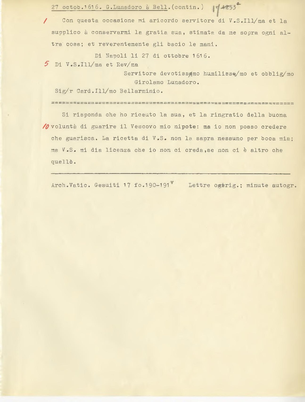 Si risponda che ho riceuto la sua, et la ringrazio della buona voluntà di guarire il Vescovo mio nipote: ma io non posso credere che guarisca. La ricetta di V.S. non la sapra nessuno per boca mia; ma V.S. mi dia licenza che io non ci creda, se non ci è altro che quello.