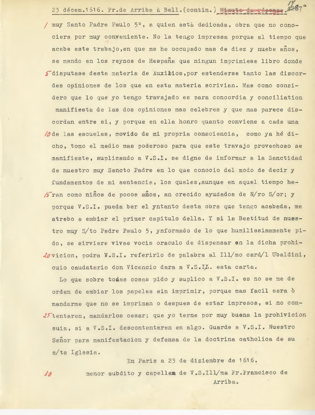 Lo que sobre todas cosas pido y suplico a V.S.I. es no se me de orden de embiar los papeles sin imprimir, porque mas facil sera ò mandarme que no se impriman o despues de estar impresos, si no contentaren, mandarlos cesar; que yo terne por muy buona la prohivicion suia, si a V.S.I descontentaren en algo. Guarde a V.S.I. Nuestro Seňor para manifestacion y defensa de la doctrina catholica de su s.ta Iglesia.