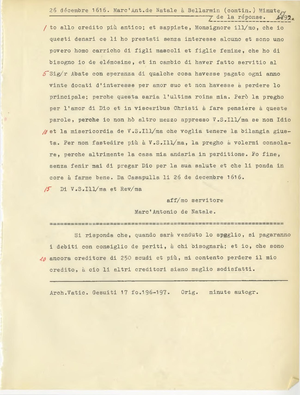 allo credito più antico; et sappiate, Monsignore ill.mo, che io questi denari ce li ho prestati senza interesse alcuno et sono uno povero homo carricho di figli muscoli et figlie femine, che ho di bisogno io de elemosine, et in cambio di haver fatto servitio al Sig.r Abate con speranza di qualche cosa havesse pagato ogni anno vinte docati d'interesse per amor suo et non havesse à perdere lo principale; perche questa saria l'ultima roina mia. Però la pregho per l'amor di Dio et in visceribus Christi à fare pensiero à queste parole, perche io non ho altro mezzo appresso V.S. Ill.ma se non Idio et la misericordia de V.S. Ill.ma che voglia tenere la bilangia giusta. Per non fastedire più à V.S. Ill.ma, la pregho à volermi consolare, perche altrimente la casa mia andaria in perditione. Fo fine, senza fenir mai di pregar Dio per la sua salute et che li penda in core à farme bene. Da Casapulla li 26 de decembre 1616.