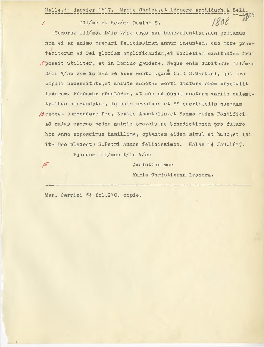 Memores Ill.mae D.is V.ae erga nos benevolentiae, non possumus non ei ex animo precari felicissimum annum ineuntem, quo more praeteritorum ad Dei gloriam amplificandam, et Ecclesiam exaltandam frui possit utiliter, et in Domino gaudere. Neque enlm dubitamus Ill.mae D.is V.ae eam in hac re esse mentem, quam fuit S. Martini, qui pro populi necessitate, et salute sanctae morti diuturniorem praetulit laborem. Precamur praeterea, ut nos ad domum nostram variis calamitatibus circundatam, in suis precibus et SS. sacrificiis nunquam cesset commendare Deo, Beatis Apostolis, et Summo etiam Pontifici, ad cujus sacros pedes animis provolutae benedictionem pro futuro hoc anno exposcimus humillime, optantes eidem simul et hunc, et (si ita Deo placeat) S. Petri annos felicissimos. Halae 14 Jan.1617.