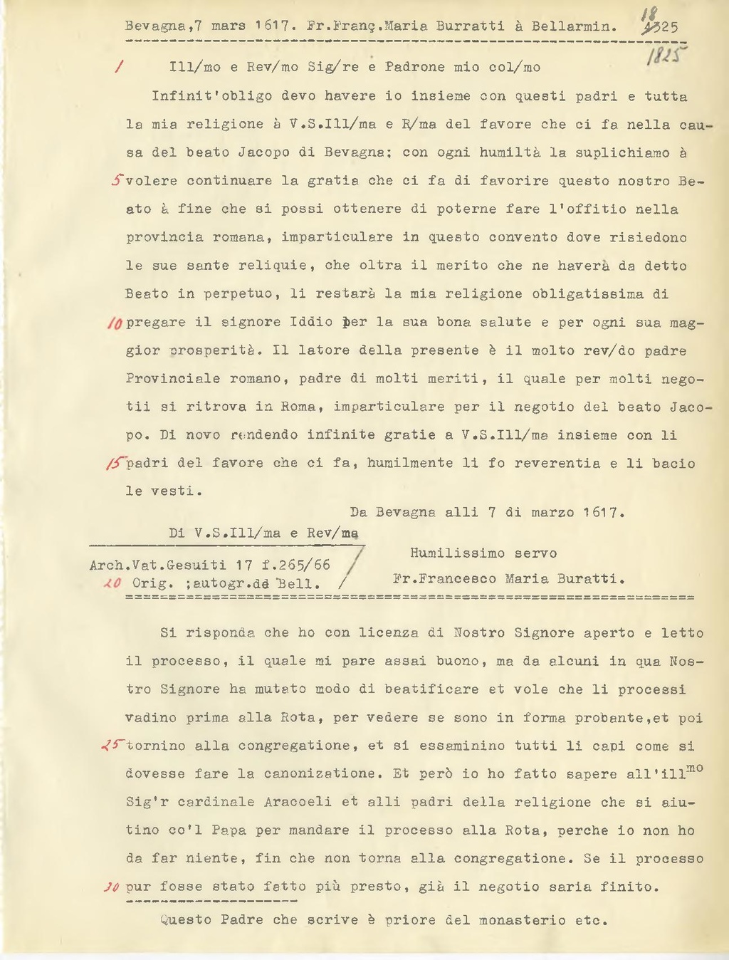 Infinit'obligo devo havere io insieme con questi padri e tutta la mia religione à V.S. Ill.ma e R.ma del favore che ci fa nella causa del beato Jacopo di Bevagna; con ogni humiltà la suplichiamo à volere continuare la gratia che ci fa di favorire questo nostro Beato à fine che si possi ottenere di poterne fare l'offitio nella provincia romana, imparticulare in questo convento dove risiedono le sue sante reliquie, che oltra il merito che ne bavera da detto