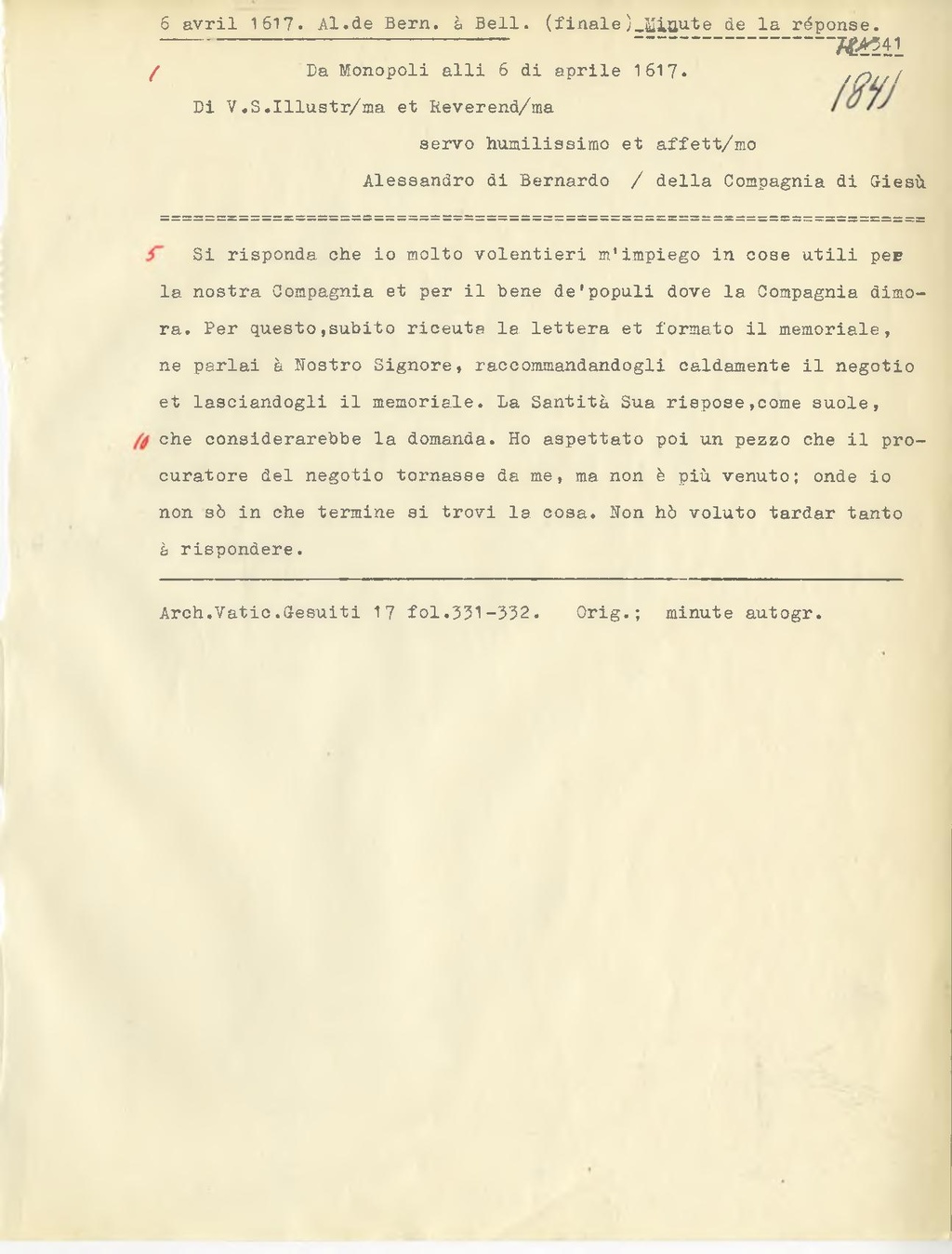 Si risponda che io molto volentieri m'impiego in cose utili per la nostra Compagnia et per il bene de'populi dove la Compagnia dimora. Per questo, subito riceuta la lettera et formato il memoriale, ne parlai à Nostro Signore, raccommandandogli caldamente il negotio et lasciandogli il memoriale. La Santità Sua rispose, come suole, che considerarebbe la domanda. Ho aspettato poi un pezzo che il pro curatore del negotio tornasse da me, ma non è più venuto; onde io non sò in che termine si trovi la cosa. Non hò voluto tardar tanto à rispondere.