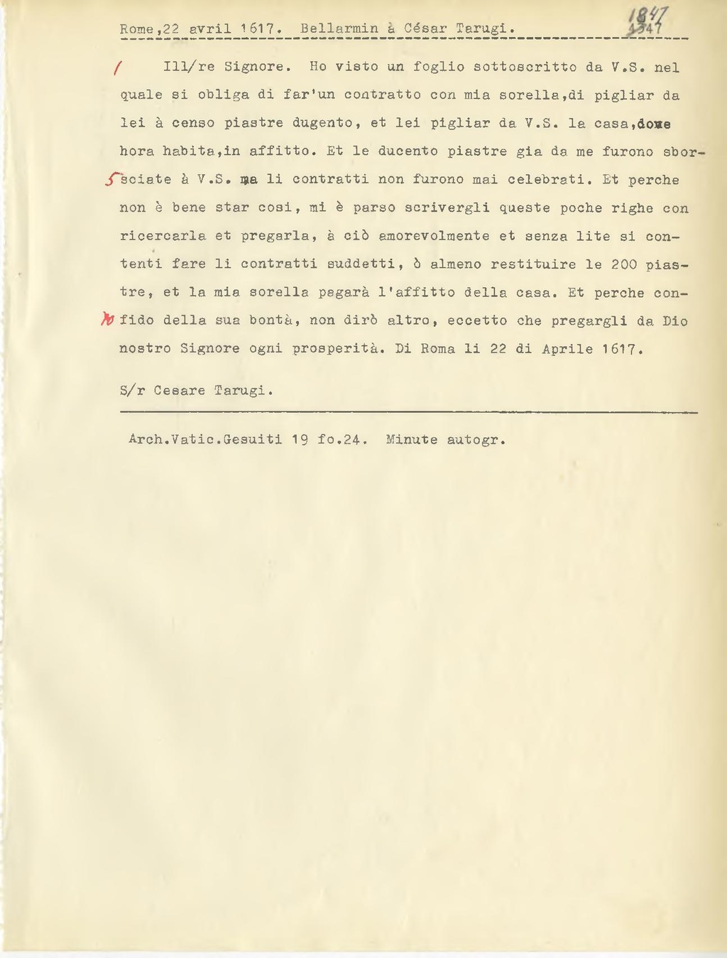 Ill.re Signore. Ho visto un foglio sottoscritto da V.S. nel quale si obliga di far'un contratto con mia sorella, di pigliar da lei à censo piastre dugento, et lei pigliar da V.S. la casa, dove hora habita, in affitto. Et le ducente piastre già da me furono sborsciate à V.S. va li contratti non furono mai celebrati. Et perche non è bene star cosi, mi è parso scrivergli queste poche righe con ricercarla et pregarla, à ciò amorevolmente et senza lite si contenti fare li contratti suddetti, ò almeno restituire le 200 piastre, et la mia sorella pagarà l'affitto della casa. Et perche confido della sua bontà, non dirà altro, eccetto che pregargli da Dio nostro Signore ogni prosperità. Di Roma li 22 di Aprile 1617.