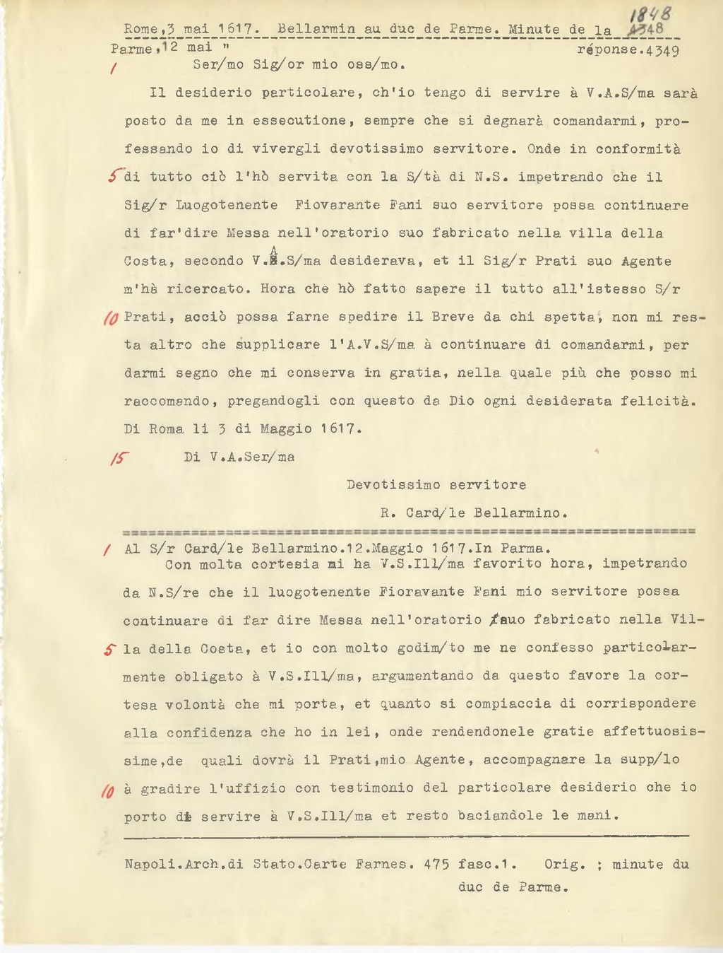 Al S.r Card.le Bellarmino. 12. Maggio 1617. In Parma.