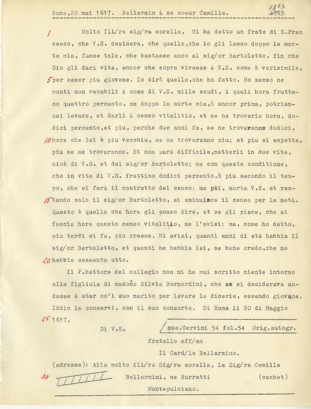 Il P.Rettore del collegio non mi ha mai scritto niente intorno alla figliola di madoña Silvia Bernardini, che sa si desiderava andasse à star co'l suo marito per levare le dicerie, essendo giovane. Iddio la conservi, con il suo consorte. Di Roma li 20 di Maggio 1617.