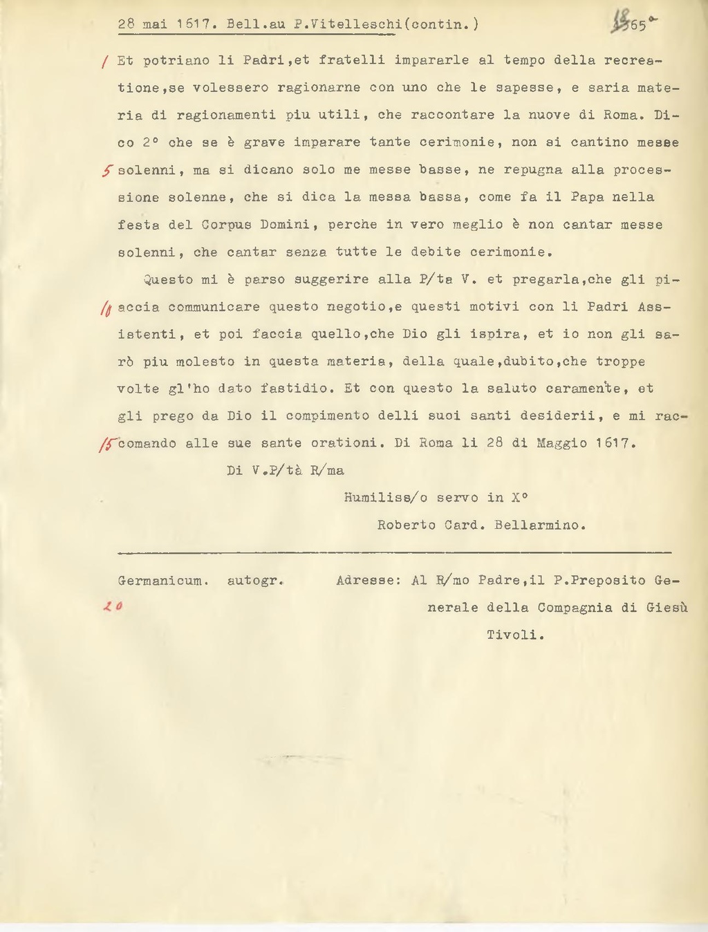 Questo mi è parso suggerire alla D.ta V. et pregarla, che gli piaccia communicare questo negotio, e questi motivi con li Padri Assistenti, et poi faccia quello, che Dio gli ispira, et io non gli sarò piu molesto in questa materia, della quale, dubito, che troppe volte gl'ho dato fastidio. Et con questo la saluto caramente, et gli prego da Dio il compimento delli suoi santi desiderii, e mi raccomando alle sue sante orationi. Di Roma li 28 di Maggio 1617.