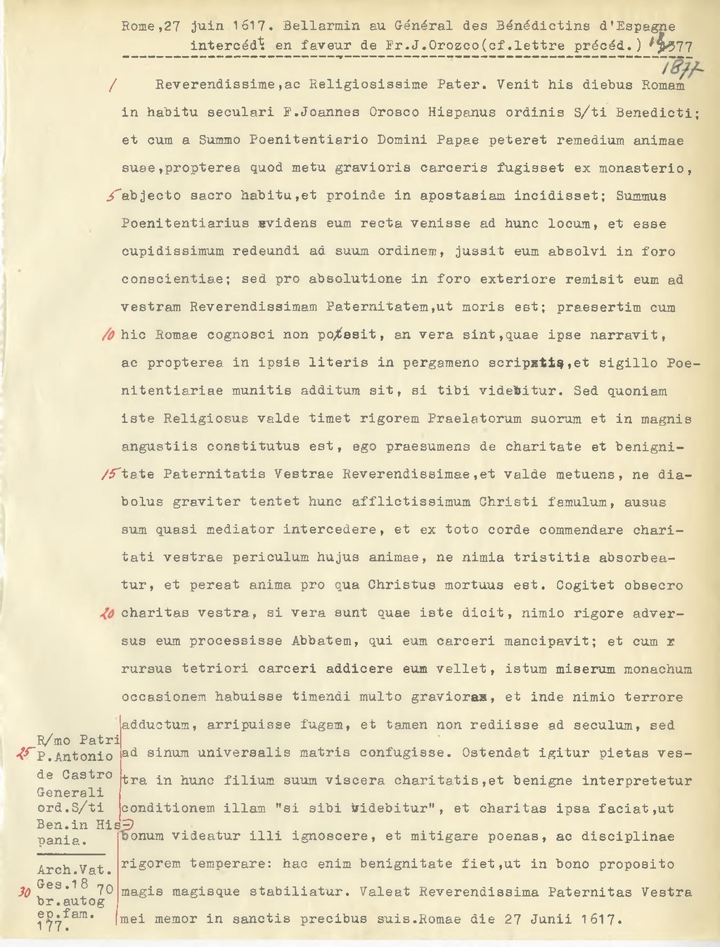 Reverendissime, ac Religiosissime Pater. Venit his diebus Romam in habitu seculari F. Joannes Orosco Hispanus ordinis S.ti Benedicti; et cum a Summo Poenitentiario Domini Papae peteret remedium animae suae, propterea quod metu gravioris carceris fugisset ex monasterio, abjecto sacro habitu, et proinde in apostasiam incidisset; Summus Poenitentiarius Hvidens eum recta venisse ad hunc locum, et esse cupidissimum redeundi ad suum ordinem, jussit eum absolvi in foro conscientiae; sed pro absolutione in foro exteriore remisit eum ad vestram Reverendissimam Paternitatem, ut morie est; praesertim cum hic Romae cognosci non possit, an vera sint, quae ipse narravit, ac propterea in ipsie literis in pergamene scriptis, et sigillo Poenitentiariae munitis additum sit, si tibi videbitur. Sed quoniam iste Religiosus valde timet rigorem Praelatorum suorum et in magnis angustiis constitutus est, ego praesumens de charitate et benigniste Paternitatis Vestrae Reverendissimae, et valde metuens, ne diabolus gravitar tentet hunc afflictissimum Christi famulum, ausus sum quasi mediator intercedere, et ex toto corde commendare charitati vestrae periculum hujus animae, ne nimia tristitia absorbeatur, et pereat anima pro qua Christus mortuus est. Cogitet obsecro charitas vostra, si vera sunt quae iste dioit, nimio rigore adversus eum processisse Abbatem, qui eum carceri mancipavit; et cum rursus tetriori carceri addicere eum vellet, istum miserum monachum occasionem habuisse timendi multo gravioras, et inde nimio terrore