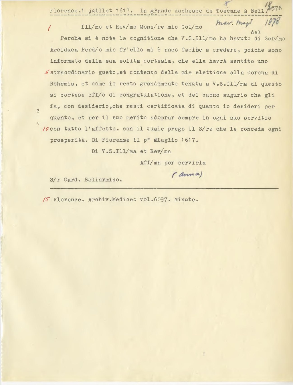 Perche mi nota la cognitione che V.S. Ill.ma ha havuto di Ser.mo Arciduca Ferd.o mio fr'ello mi è anco facile a credere, poichè sono informato della sua solita cortesia, che ella havrà sentito uno straordinario gusto,et contento della mia elettione alla Corona di Bohemia, et come io resto grandemente tenuta a V.S. Ill.ma di questo si cortese off.o di congratulatione, et del buono augurio che gli fa, con desiderio,che resti certificata di quanto io desideri per