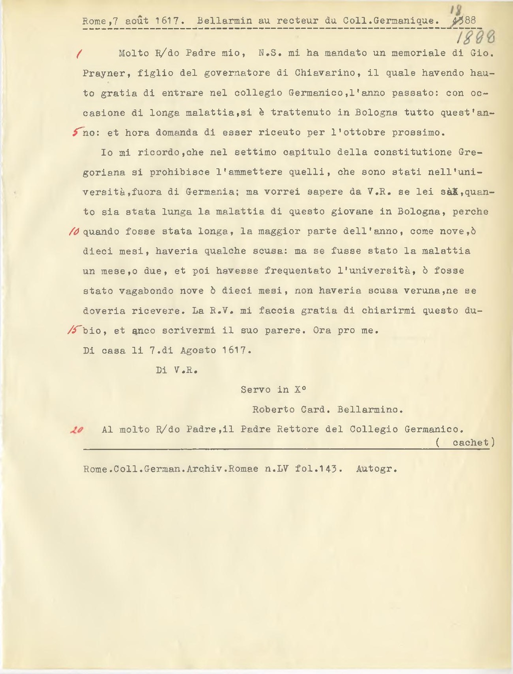 Molto R.do Padre mio, N.S. mi ha mandato un memoriale di Gio. Prayner, figlio del governatore di Chiavarino, il quale havendo hauto gratia di entrare nel collegio Germanico,l'anno passato: con occasione di longa malattia, si è trattenuto in Bologna tutto quest'anno: et hora domanda di esser riceuto per l'ottobre prossimo.