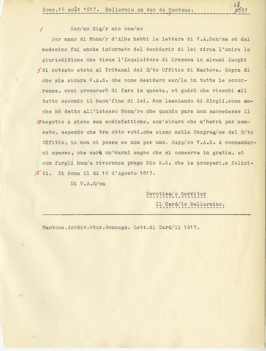 Per mano di Mons.r d'Alba hebbi la lettera di V.A. Ser.ma et dal medesimo fui anche informato del desiderio di lei circa l'unire la giurisditione che tiene l'Inquisitore di Cremona in alcuni luoghi di cotesto stato al Tribunal del S.to Offitio di Mantova. Sopra di che sia sicura V.A.S. che come desidero ser.la in tutte le occorrenze, così procurerò di fare in questa, et godrò che rieschi il tutto secondo il buon'fine di lei. Non lasciando di dirgli, come anche hò detto all'istesso Mons.re che quando pure non succedesse il negotio à piena sua sodisfattione, son'sicuro che m'havrà per sensato, sapendo ohe tra otto voti, che siamo nella Congreg.ne del S.to Offitio, io non ci posse se non per uno. Supp.co V.A.S. à commandar mi spesso, che sarà un'darmi segno che mi conserva in gratia, et con fargli hum.a riverenza prego Dio N.S. che la prosperi, e feliciti. Di Roma il di 16 d'Agosto 1617.